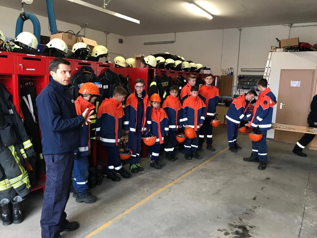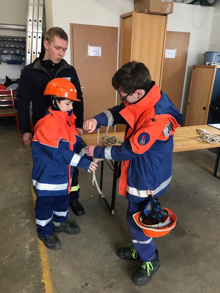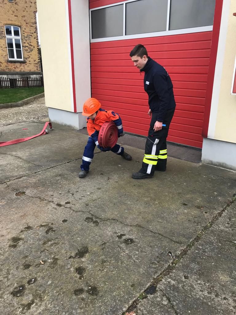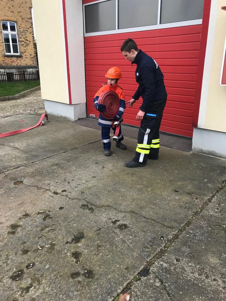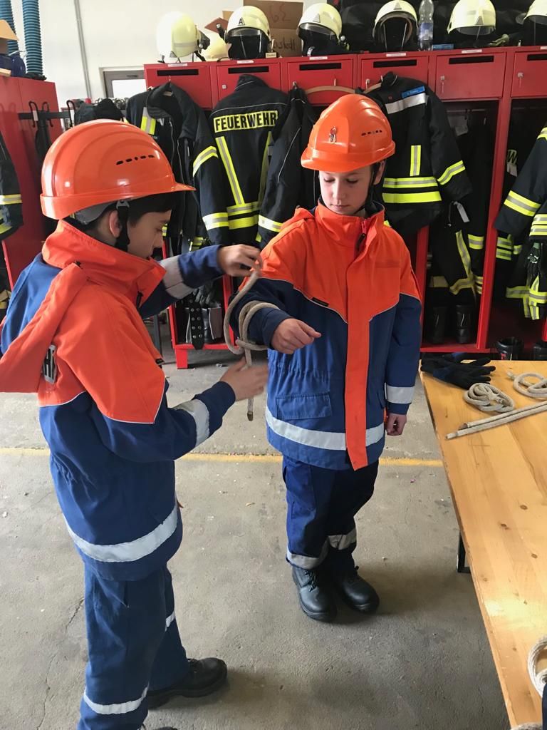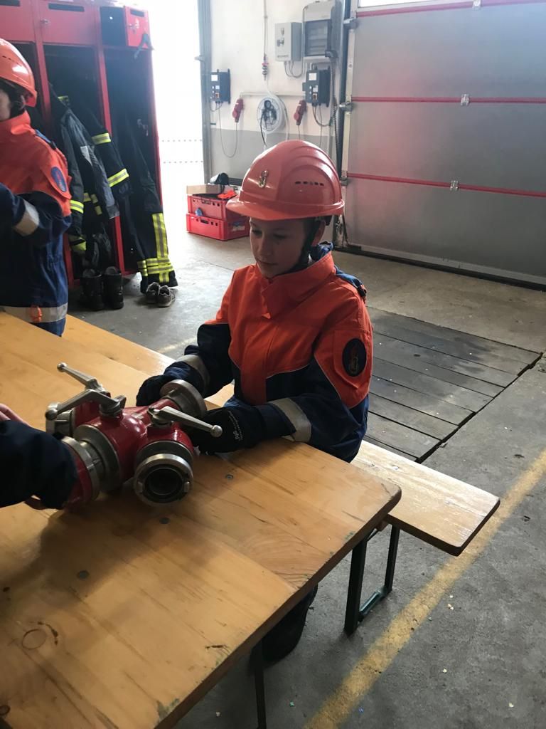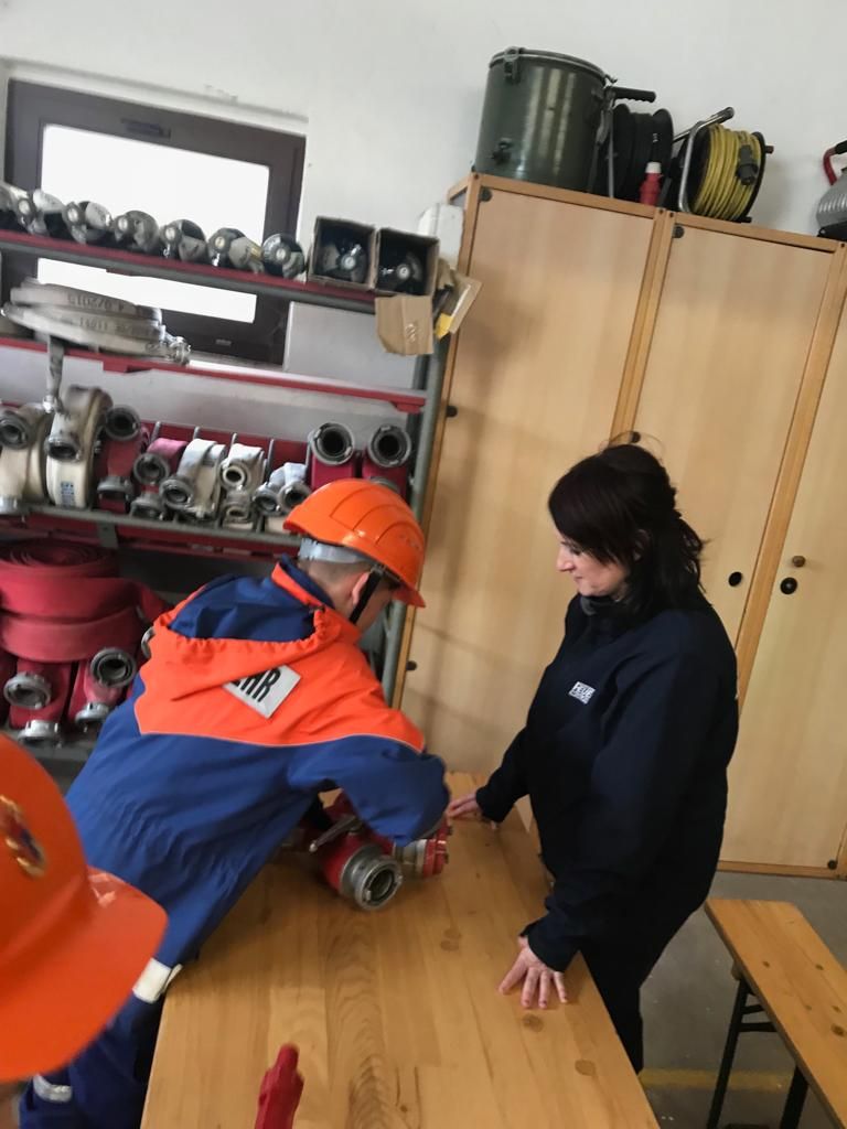 Dafür mussten unter anderem Schläuche ausgerollt, gekuppelt, Knoten gebunden, die Beladung des Löschgruppenfahrzeuges erläutert, ein Standrohr gesetzt und die Inhalte des Notrufs erklärt werden.