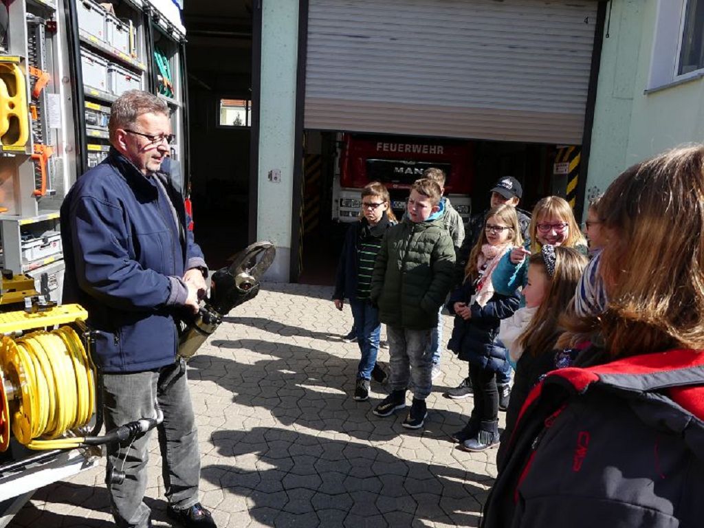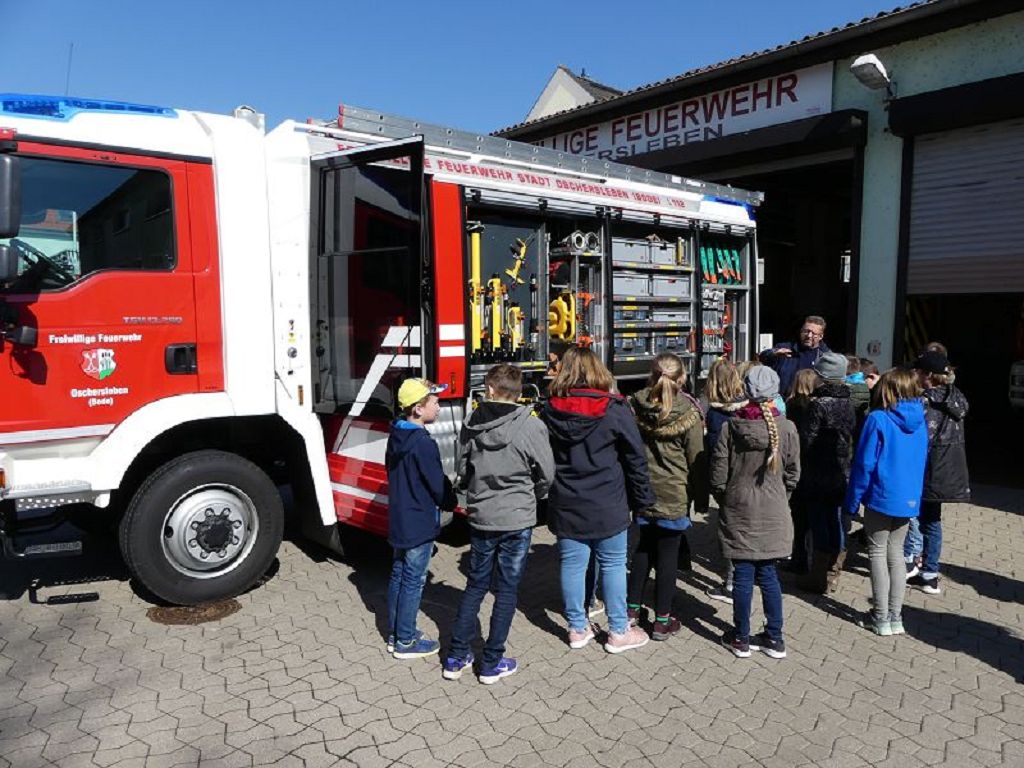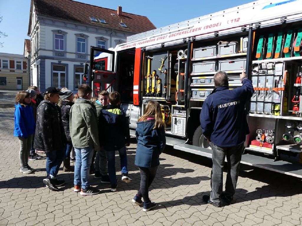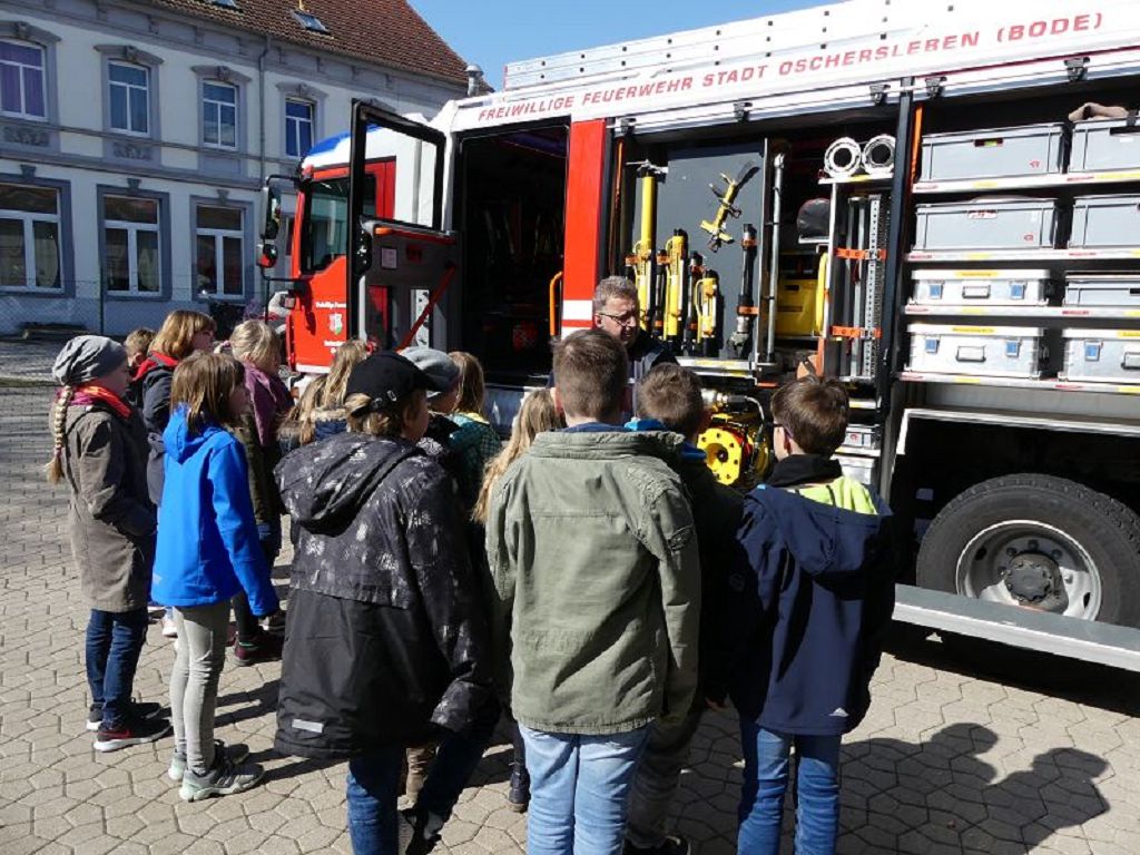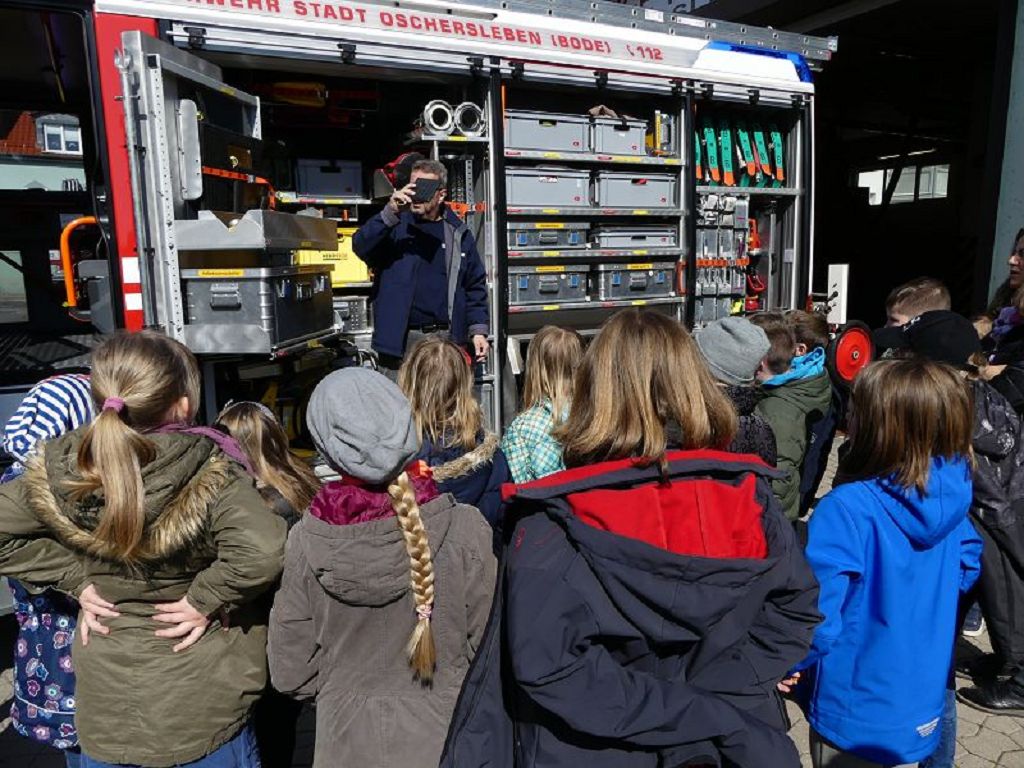 So lernten die Kinder, dass die Feuernutzung, ein sehr wichtiger Schritt für die Entwicklung der Menschheit war. Neben der Feuernutzung ging es dann auch um die Brandschutzerziehung und Brandverhütung. So wurde im Unterricht das richtige Absetzen eines Notrufes geübt, die verschiedenen Brandklassen erläutert und auch das Auffinden von Hydranten ausprobiert. Auch über verschiedene Löschmittel wurde sich bereits in der Schule unterhalten. Sogar eine Klassenarbeit wurde über das Thema Feuer geschrieben. Zum Abschluss stand dann ein Besuch bei der Oschersleber Feuerwehr auf dem Stundenplan. Falk Zönnchen, hauptamtlicher Gerätewart, begrüßte die Jungen und Mädchen um Direktorin Claudia Beckurs. Zuerst ging es in den Schulungsraum. Hier erklärte Falk Zönnchen, die Struktur und die Arbeitsweise der Oschersleber Feuerwehr. So berichtete er neben den Einsätzen auch über die Arbeit der Alter- und Ehrenabteilung, sowie der Frauengruppe und der Jugendfeuerwehr. Die 4.Klässler konnten sich viele Fotos anschauen, um so einen Eindruck über die Arbeit der Feuerwehr zu gewinnen. In der Fahrzeughalle erfuhren sie dann, was eine Feuerwehrfrau/-mann, so alles an Einsatzbekleidung zur Verfügung hat. An den Einsatzfahrzeugen wurden dann verschiedene Geräte von Falk Zönnchen erläutert, wie z.B. die hydraulischen Rettungsgeräte. Natürlich durften auch alle einmal im Einsatzfahrzeug Platz nehmen. Im Anschluss bedankten sich die Kinder recht herzlich für die Führung. In den letzten 14 Jahren besuchten mehr als 7000 Kinder und Jugendliche die Oschersleber Feuerwehr und informierten sich beim Kameraden Falk Zönnchen über die Arbeit der Feuerwehr. Dafür an dieser Stelle ein großes Dankeschön.