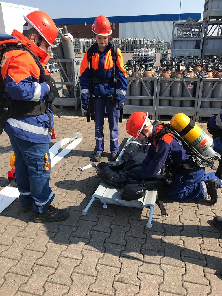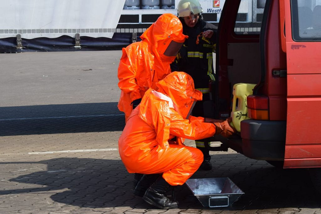 Zurück im Gerätehaus wartete dort bereits ein leckeres Mittagessen zur Stärkung. Kurz darauf folgte Einsatz Nummer drei in dieser Schicht. Unter dem Stichwort „Auslaufendes Gefahrgut aus Transporter“ ging es für die Jugendlichen auf das Betriebsgelände der Westfalen AG im Wanzleber Gewerbegebiet. Dort trat aus einem Kanister, der in einem Transporter lagerte, ein Gefahrstoff aus. Der Fahrer des Transporters musste zudem aus dem Gefahrenbereich gerettet und die Dekontamination der Einsatzkräfte sicher gestellt werden.