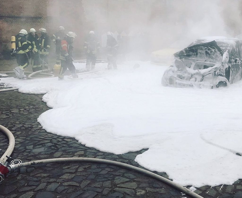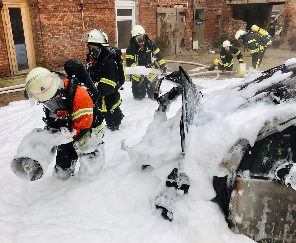 mit insgesamt 18 Kräften zur Einsatzstelle aus. Auf Anfahrt rüsteten sich bereits die beiden Angriffstrupps vom LF und vom TLF mit Atemschutzgeräten aus. Beim Eintreffen der Feuerwehr stand der PKW bereits in Vollbrand, sodass umgehend der erste Löschangriff mittels Schaumpistole eingeleitet wurde. Im weiteren Verlauf kam das Kombischaumrohr zum Einsatz. Mit Mittelschaum wurde eine Schaumdecke über den PKW ausgelegt, was den finalen Löscherfolg brachte. Um kurz nach 12 Uhr konnten die Einsatzkräfte die Einsatzstelle verlassen, ins Gerätehaus einrücken und die Einsatzbereitschaft der Fahrzeuge wieder herstellen. Nach einem Schaumeinsatz müssen alle Armaturen gründlich gespült und gereinigt werden, was einige Zeit in Anspruch nahm.“