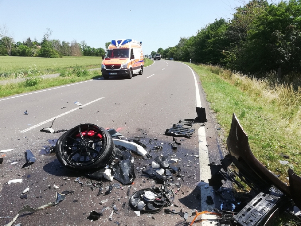 2 PKW stießen zusammen. Durch die Wucht des Aufpralls schleuderten beide Fahrzeuge in den Straßengraben. Ein Fahrer konnte das Fahrzeug selbständig verlassen. Aus dem zweiten Unfallfahrzeug konnten Ersthelfer den Beifahrer befreien. Der Fahrer jedoch wurde in seinem Fahrzeug eingeklemmt. Die Oschersleber Feuerwehr traf zeitgleich mit dem Rettungshubschrauber „Christoph 36“ aus Magdeburg ein. Denn Rettern bot sich ein schreckliches Bild. Auf der gesamten Straße lagen Trümmerteile der beiden Fahrzeuge. Bei der Erkundung durch den Einsatzleiter wurde festgestellt, dass der Fahrer massiv in seinem Fahrzeug eingeklemmt war. Sofort wurde die technische Rettung eingeleitet. Kurze Zeit später stellte der Notarzt den Tod fest. So blieb den Einsatzkräften der Feuerwehr die traurige Aufgabe den Leichnam aus dem Fahrzeugwrack zu bergen. Die Befreiung dauerte rund 45 Minuten. Der Beifahrer, sowie der Fahrer des 2. Unfallfahrzeuges wurden schwer verletzt in Krankenhäuser gebracht. Die Polizei hat die Ermittlungen zum Unfallhergang aufgenommen.