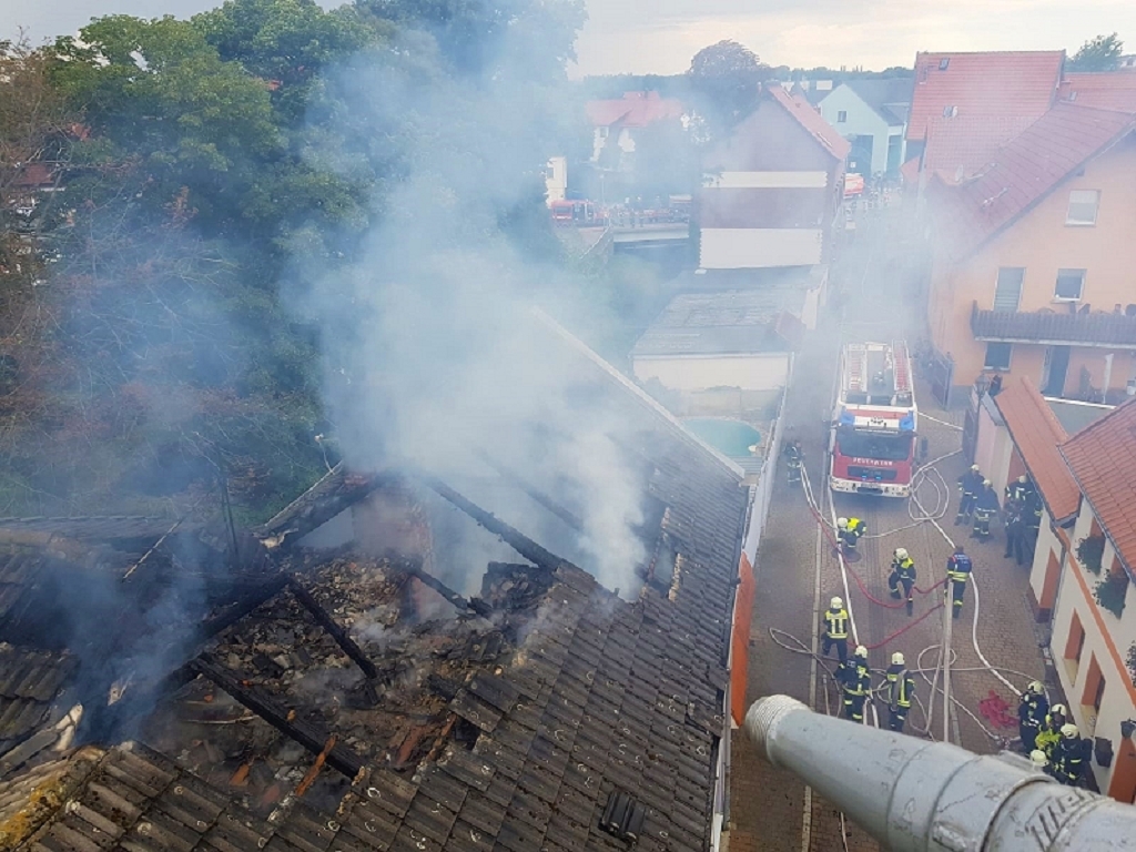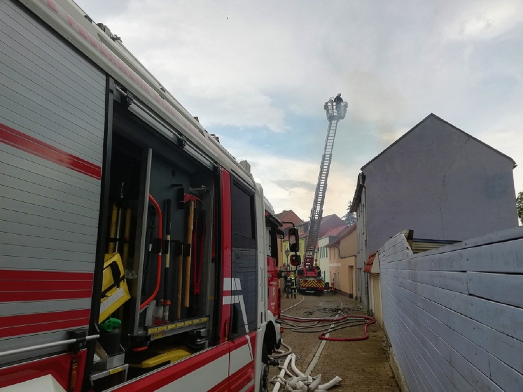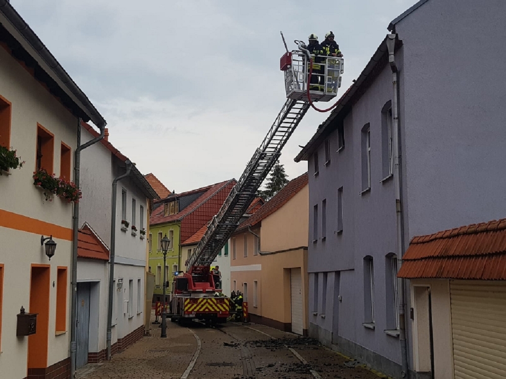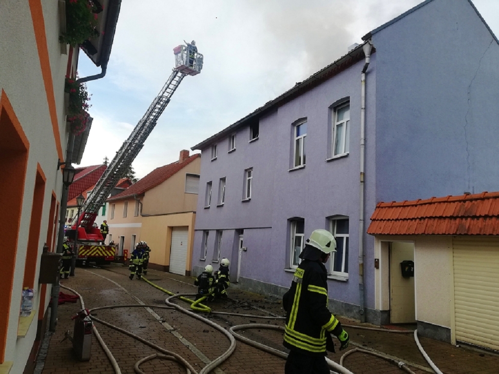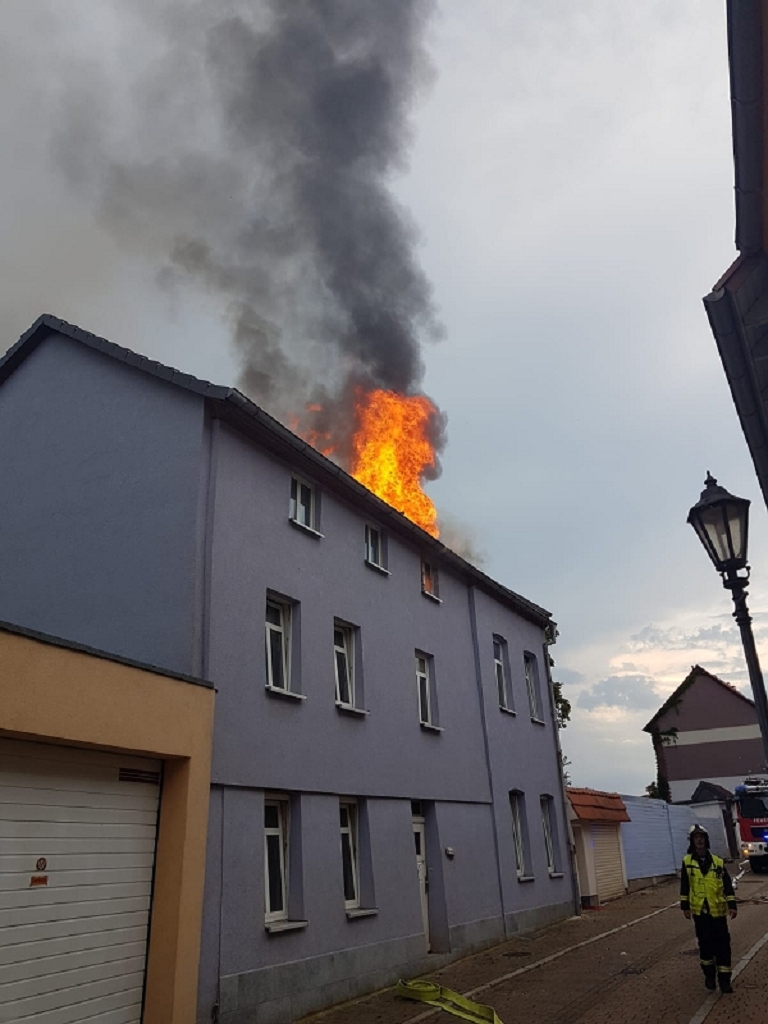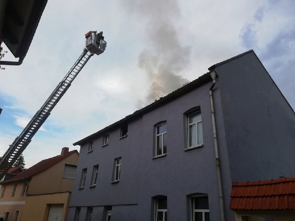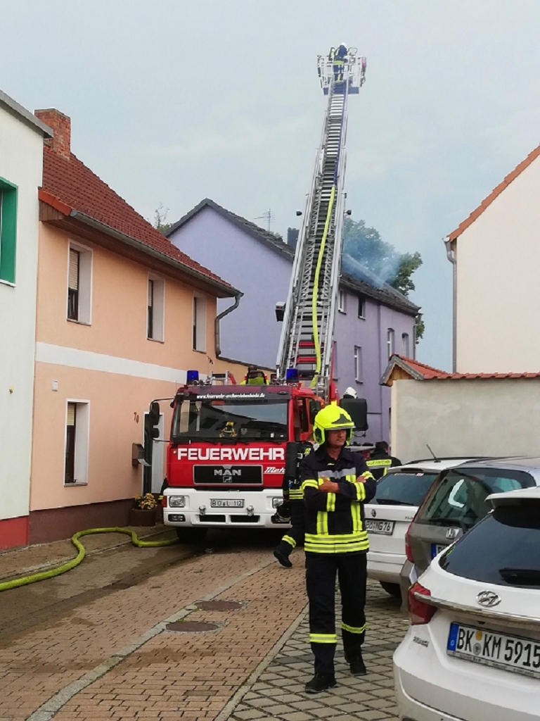 Eine schwarze Rauchwolke stand über die Einsatzstelle. Beim Eintreffen der ersten Kräfte schlugen Flammen aus dem Dachstuhl. Während die Drehleiter in Stellung gebracht wurde erkundete Einsatzleiter Carsten Loof die Lage. So konnte er zügig feststellen, dass sich keine Personen mehr im Wohnhaus aufhielten. Aufgrund der engen Bebauung erhöhte er auf 2. Alarm. Daraufhin alarmierte die Rettungsleitstelle die Feuerwehren Hordorf und Hornhausen. Ein Trupp ging unter Atemschutz sofort zur Brandbekämpfung in das Dachgeschoß vor. Ein weiteres Rohr wurde im Außenangriff vorgenommen. Währenddessen wurde eine Löschwasserversorgung von einem Hydranten aus aufgebaut. Jetzt konnte auch der Löschangriff über die Oschersleber Drehleiter mit dem Wendestrahlrohr erfolgen. Durch das schnelle Eingreifen der Einsatzkräfte konnte eine weitere Ausbreitung des Brandes verhindert werden. Aufgrund der Wetterlage setzte Einsatzleiter Carsten Loof die Atemschutztrupps so kurz wie möglich ein. So wurde die Kräfte regelmäßig durchgewechselt. Am aufwendigsten gestalteten sich die Kräfte zehrenden Nachlöscharbeiten. Teile des Daches mussten entfernt werden. Im Inneren mussten Vertäfelungen und Dämmungen entfernt werden, um an die Glutnester zu kommen. Hierbei kam auch eine Wärmebildkamera zum Einsatz. Im Verlauf des Einsatzes mussten 2 Einsatzkräfte der Oschersleber Feuerwehr mit Kreislaufproblemen vom Rettungsdienst und Notarzt versorgt werden und ins Krankenhaus nach Neindorf gebracht werden. Nach ambulanter Behandlung konnten sie am Abend noch, wieder aus der Klinik entlassen werden. Nach 3 Stunden konnte der Einsatz beendet werden. Gegen 20.30 Uhr meldet sich erneut die Rettungsleitstelle. Anwohner bemerkten wieder Rauch im Dachbereich. So rückte die Oschersleber Feuerwehr erneut in die Untere Mauerstraße aus. Über die Drehleiter wurden weitere Glutnester abgelöscht. Auch hier wurde noch einmal mit einer Wärmebildkamera nachkontrolliert. Nach rund einer Stunde war der Einsatz beendet. Neben den eingesetzten Kräften der Feuerwehr, waren auch die Polizei, mehrere Rettungswagen und ein Notarzt im Einsatz. Zur Brandursache ermittelt die Polizei. Ortswehrleiter Carsten Loof möchte sich noch einmal recht herzlich bei allen eingesetzten Kräften bedanken. Ein weiteres Dankeschön richtete er an das Einkaufszentrum Marktkauf, für die Bereitstellung von Getränken.