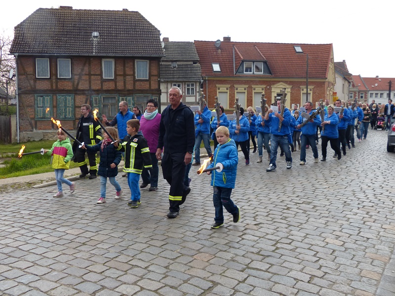 Pünktlich um 19.00 Uhr startete der Fackelumzug angeführt von der Schalmeienkapelle Sülldorf. Selbst der auch pünktlich einsetzende Regen tat der Stimmung keinen Abbruch. Begleitet von Feuerwehr und Polizei ging es dann durch die Straßen Hornhausens zum Sportplatz. Hier wurde das große Feuer entzündet, welches in den vergangenen Tagen mit Unterstützung der Bürger aufgeschichtet wurde. Die Kameradinnen und Kameraden hatten schon reichlich Würstchen auf dem Grill bereitgelegt und das Wetter zeigte sich dann doch noch gnädig, so dass die Hornhäuser gebührend den Mai begrüßen konnten.