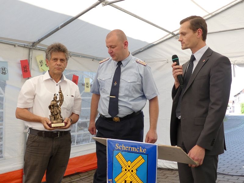 Am heutigen Tag verfügt die Feuerwehr Schermcke über 10 Mitgliedern in der Alters-und Ehrenabteilung, 11 in der Jugendfeuerwehr und 20 aktive Einsatzkräfte. Auch in den Grußworten der Gäste spiegelte sich die sehr gute Arbeit der Feuerwehr wieder. Dank und Anerkennung gab es in Wort und Ehrengeschenken. Organisator der Jubiläumsfeier Lothar Lindecke bedankte sich ebenfalls für die Unterstützung bei allen Beteiligten. Im Anschluss konnten die Gäste sich an aktuellen und historischen Infotafeln über die Arbeit der Feuerwehr informieren. Für die kleinen Besucher wurde eine Malstraße und eine Hüpfburg aufgebaut. Auch konnte die aktuelle und vergangene Einsatztechnik besichtigt werden. Für das leibliche Wohl war natürlich auch gesorgt.