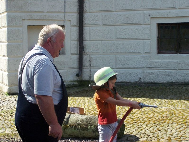 Ortswehrleiter Detlef Heine und seine Kameraden brachten auch gleich das große Löschfahrzeug mit. Die Kinder erfuhren von den Feuerwehrleuten das richtige Verhalten bei einem Notfall oder Brand in der Kindertagesstätte. Einige der Steppkes wussten sogar schon die Notrufnummer der Feuerwehr und bekamen dafür viel Lob. Nach der kleinen Schulung ging es dann an das Feuerwehrfahrzeug. Hier konnten die Kleinen alles genau erkunden und bekamen viele Einsatzgeräte erklärt. Im Anschluss wurden ein paar Büchsen aufgebaut und die Kinder durften mit Helm und Strahlrohr bewaffnet mal richtig mit Wasser auf die Büchsen schießen. Aber nicht nur das Fahrzeug hatten die Kameraden mitgebracht, sondern auch Bälle, Malbücher und Sandkastenspielzeug hatten sie im Gepäck. Die Kinder der Kita "Burggeister" bedankten sich im Gegenzug mit einem tollen Lied bei den Kameraden der Ampfurther Feuerwehr.