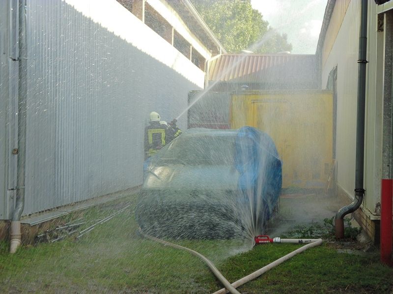 Brandobjekt war eine Reithalle. Das Feuer drohte auf benachbarte Gebäude, in dem Fall ein Strohlager und Stallungen, überzugreifen. So mussten die Einsatzkräfte das Wasser über eine lange Wegestrecke zum angenommenen Brandobjekt führen. Unter Vornahme von mehreren C- Rohren konnten die umstehenden Gebäude geschützt werden. Auch wurde ein Hydroschild zum Gebäudeschutz aufgebaut. Über das Wendestrahlrohr der Oschersleber Drehleiter wurde dann die Brandbekämpfung der Lagerhalle vorgenommen.
