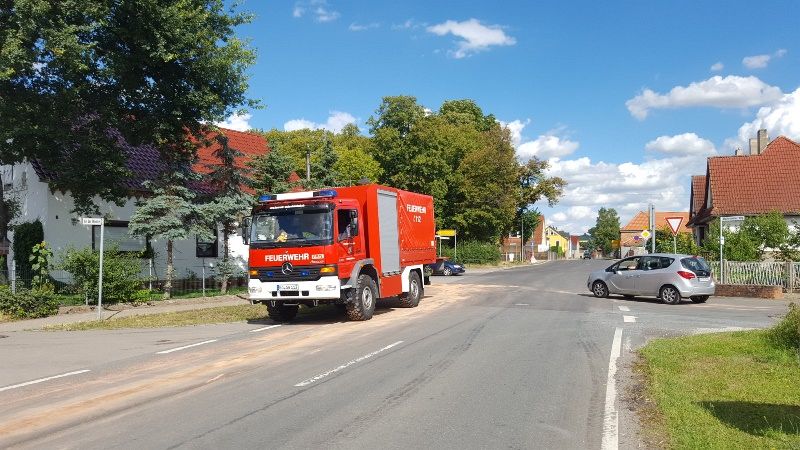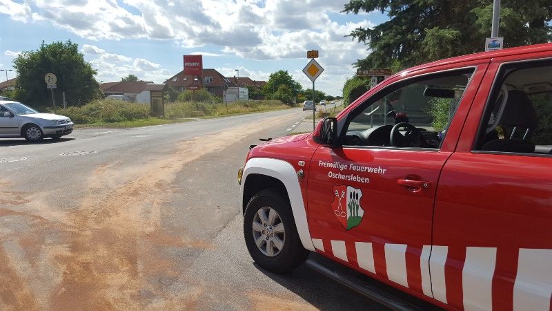 Ein landwirtschaftliches Fahrzeug hatte Öl verloren und blieb aufgrund des Defektes auf der B246 hinter dem Ortsausgang in Richtung Neuwegersleben liegen. Innerhalb der Ortslage wurde das Öl von den Kräften der Feuerwehr mit Bindemittel abgestreut. Außerdem wurde vom Einsatzleiter eine Kehrmaschine angefordert.  Auf der Bundesstraße kam die Ölwehr Sachsen Anhalt zum Einsatz. Neben der Feuerwehr war auch die Polizei im Einsatz.