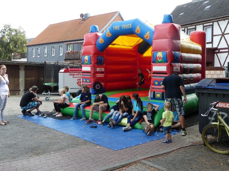Im Anschluss stellte die Jugendwehr ihre Leistungsfähigkeit unter Beweis. Schnell wurden die Schläuche ausgerollt und zusammengekuppelt und schon hieß es "Wasser marsch" aus allen Strahlrohren. Bei bestem Wetter tummelten sich die Besucher auf dem Hof der Feuerwehr und ließen sich Kaffee und Kuchen, sowie leckeres Gegrilltes schmecken. Viele Besucher nutzten die Möglichkeit, sich die Feuerwehrtechnik genau anzuschauen. Die Kleinen Besucher belagerten bis zum Abend die große Hüpfburg.