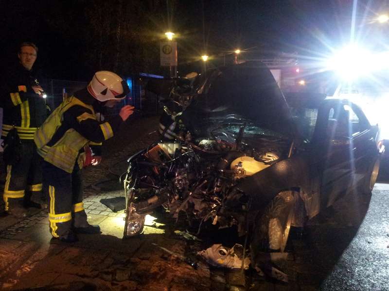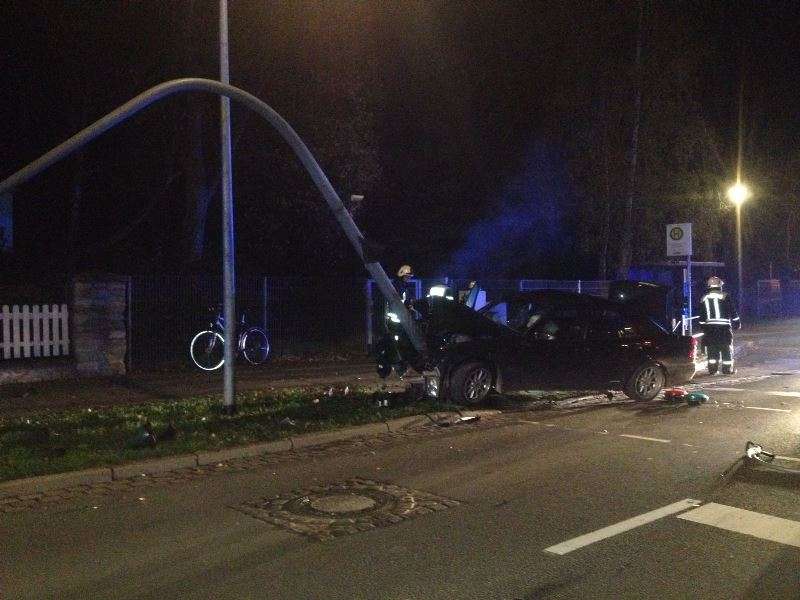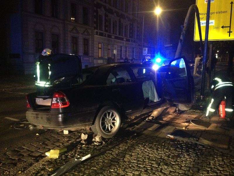 Aus noch unbekannter Ursache fuhr ein PKW mit 2 Insassen erst in ein Straßengeländer und stieß dann frontal gegen einen Ampelmast. Die Ampel wurde hierbei völlig zerstört. Sofort wurde eine Löschbereitschaft vom Tanklöschfahrzeug aus aufgebaut. Die beiden PKW - Insassen wurden zur ambulanten Versorgung, von einem Rettungswagen ins Krankenhaus verbracht. Über den Bereitschaftsdienst der Stadt Oschersleben wurde ein Elektriker zur Einsatzstelle gebracht, der die Ampelanlage stromlos schaltete. Ein kleiner Schwelbrand im zerstörten Motorbereich des Unfallfahrzeuges, konnte von der Feuerwehr zügig gelöscht werden. Während der Bergungsmaßnahmen wurden auslaufende Betriebsstoffe abgestreut und aufgenommen. Auch das zerstörte Geländer und die Ampel wurden von den Kräften der Feuerwehr gesichert.