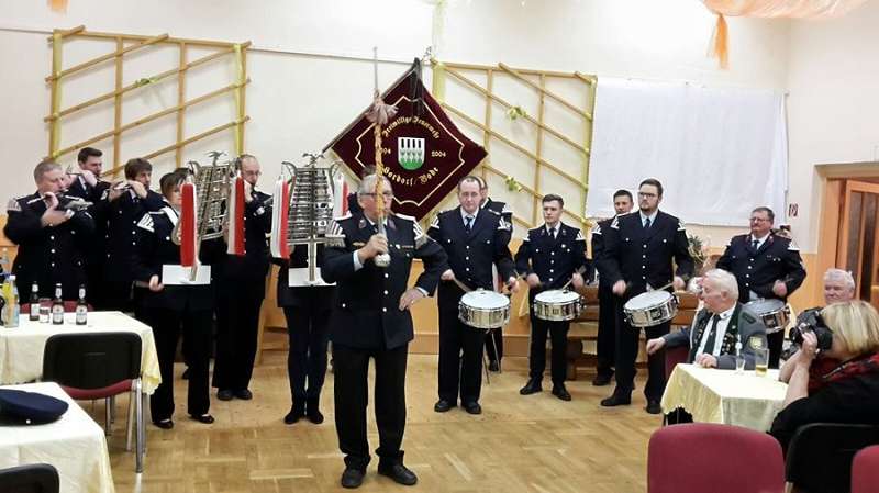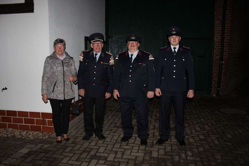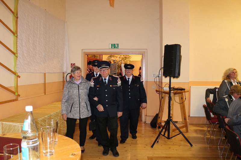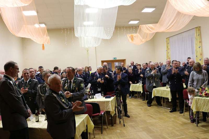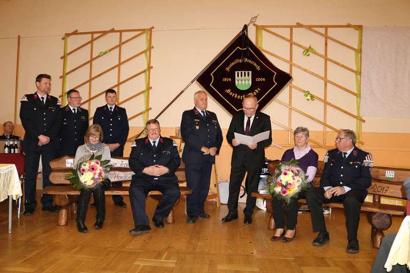 Nachdem sich der Saal beruhigt hatte und die Spielmannszüge ihre Plätze eingenommen hatten, begrüßte Andy Graeger die zahlreich erschienenen Gäste, so unter anderem den Landrat Hans Walker, den Kreisfeuerwehrverband vertreten durch Harald Hinz und den Fachbereichsleiter der Alters- und Ehrenabteilung Lothar Rosenberg, Abschnittsleiter Ralf Lange, Kreisstabführer Henrik Zimmermann, den stellvertretenden Bürgermeister der Stadt Oschersleben Gerd Ludwig, sowie den Ortsbürgermeister von Hordorf Norbert Kurzel. Auch der ehemalige Bürgermeister der Stadt Oschersleben Dieter Klenke, die Alters- und Ehrenabteilung der FF Hordorf, eine Abordnung der Feuerwehr und des Schützenvereins des Partnerortes Hordorf/Niedersachsen, sowie Abordnungen verschiedener Schützenvereine aus dem Bördekreis, bei denen der Spielmannszug in den letzten Jahrzehnten traditionell gespielt hatte. Im Anschluss wurde von Rainer Dubois ein kurzer Abriss über den Werdegang von Wolfgang und Bernd in der Feuerwehr gehalten und stellte fest: „ Ihr beide steht, bezogen auf den Spielmannszug zusammengerechnet seit 94 Jahren für Idealismus, Überzeugung und vor allem aber auch für Verantwortung". An diese Worte anknüpfend, bedankte sich Wehrleiter Maik Fischer, stellvertreten für den gesamten Spielmannszug, bei den beiden: „40 bzw. 50 Jahre seid ihr beide immer vorweg gegangen. Ihr habt die Richtung angezeigt, den Takt vorgegeben und darauf geachtet, dass alles in Reih und Glied bleibt"