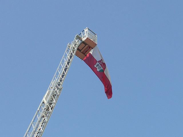 In dreißig Meter Höhe, am Ende der Drehleiter, wehte weithin sichtbar, die Fahne der Stadt Oschersleben, eine interessante Möglichkeit für Bürgerinnen und Bürger der Stadt sowie Gästen aus nah und fern, die Technik der Stadtfeuerwehr anzusehen, eine deftige Bratwurst, Nudeln vom Pizzabäcker, Getränke verschiedenster Art zu kosten sowie Lifemusik von zwei Bands zu erleben.