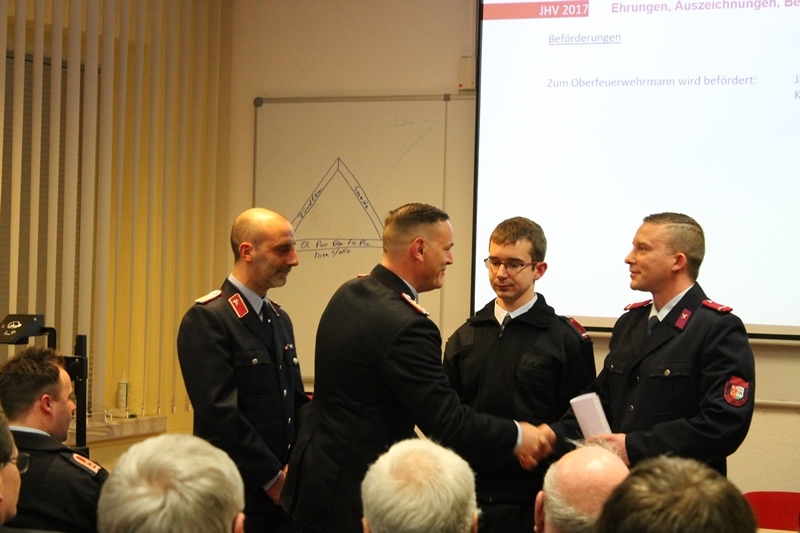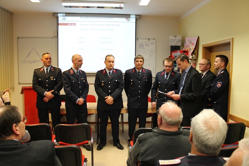 Neben den Einsätzen, waren aber auch einige Veranstaltungen dabei, die viel Zeit in Anspruch nahmen, wie z.Bsp. der alljährliche Weihnachtsmarkt, aber auch der Tag der Regionen sowie einige Martinsumzüge und ein großes Sommerfest. Dem Bericht des Wehrleiters, folgte Jugendfeuerwehrwart Thomas Ehrhardt mit der Berichtserstattung der Jugendfeuerwehr. Auch er konnte über viele Aktivitäten im Jahr 2016 berichten.  So fand im Februar eine Faschingsfeier gemeinsam mit der THW Jugend statt. Im Mai folgte das jährliche Projektwochenende mit vielen Übungen. Zwischenzeitlich wurde auch fleißig an einem Boot für das im Juni stattfindende Boderennen gebaut. Höhepunkt war sicherlich die Fahrt in den Freizeitpark Plöhn anlässlich des 55zigsten Geburtstages der Oschersleber Jugendfeuerwehr. Ein Besuch bei der Berufsfeuerwehr Magdeburg stand ebenso auf dem Programm wie eine gruslige Halloween Party. Neben den Ausflügen und Veranstaltungen, trafen sich die Mitglieder der Jugendfeuerwehr auch zu ihren wöchentlich stattfindenden Ausbildungsdiensten. Bürgermeister Benjamin Kanngießer lobte den Einsatz alle Kameradinnen und Kameraden und bedankte sich für die vielen geleisteten Stunden im Ehrenamt. Dem schlossen sich alle Gäste an.