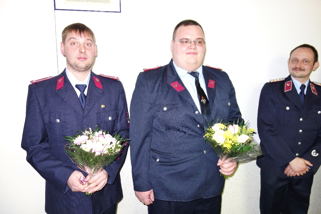 Nach Ausbildungsmaßnahmen und ihrem großen Engagement innerhalb unserer Wehr konnten die Kameraden Patrick Müller und Jens Kneisel zu Hauptfeuerwehrmänner befördert werden. Ihre neuen Schulterstücke wurden ihnen sogleich vom Gemeindewehrleiter Christian Marquardt und dem Leiter der Verwaltungsgemeinschaft Westliche Börde, Fabian Stankewitz "anmontiert".