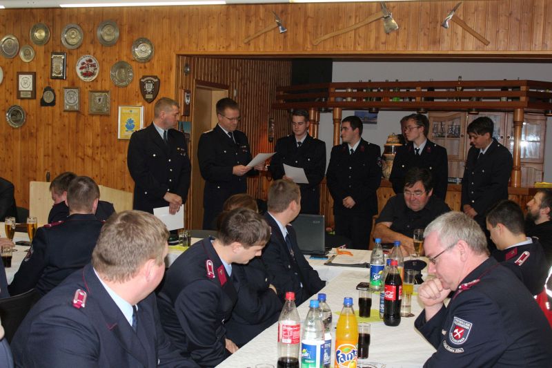 Freudiger Höhepunkt des Abends waren die vier neuen Verpflichtungen der Feuerwehrangehörigen Mandy Rügenhagen, Dominik Reuer, Dennis Biermann und Daniel Valentin für den Einsatzdienst. Leider wurde Klaus Poor auf der Versammlung für seine Teilnahme am Einsatzdienst entpflichtet, da er im vergangenen Jahr die Altersgrenze für die Mitarbeit in der Einsatzabteilung erricht hat. Frank Frenkel entschuldigte sich für die ,,verspätete'' Entpflichtung und scherzte, ,,wir haben bis zuletzt gehofft, dass das Land schneller sei als wir'' und spielte damit auf die Änderung des Brandschutzgesetzes von Sachsen-Anhalt an, in der die Altersgrenzen für den Einsatzdienst erhöht werden sollten. Klaus Poor verrichtete seit 1972 seinen Dienst in der Feuerwehr Hötensleben.