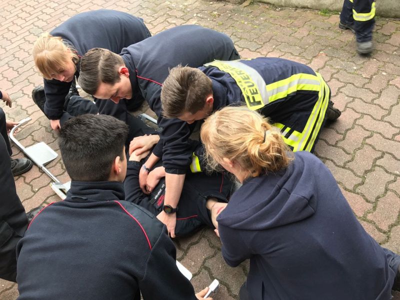 Am Samstag ging es dann tief hinein in die eigentliche Thematik. Dazu wurde der Rettungsdienst der Firma ASG in Sternwarte / Stromab besucht. Dort wurden verschiedene Themenbereiche erklärt und geübt, zum Beispiel die Halswirbelsäulen-Immobilisation mit Stiffneck), das Anlegen von Extremitäten-Immobilisationsmitteln (Vakuum Schienen), das Anlegen eines Rettungskorsetts, der Umgang mit Schaufeltrage und Vakuummatratze und auch generell der Umgang mit Rettungsmitteln wie Trage und Tragstuhl des Rettungswagens. Nach einem sehr informativen Vormittag, mit super Ausbildern, ging es zum gemeinsamen Mittagessen und anschließend zum Rettungszentrum am Bundeswehrkrankenhaus Hamburg. Nach einer kurzen Besichtigungstour durch das Rettungszentrum mit Erklärung der Feuerlöschtechnik auf dem Hubschrauberlandeplatz wurden der Rettungshubschrauber Christoph 29 und die stationierten Notarztwagen besichtigt. Hier waren insbesondere die Erläuterungen des Piloten und des anwesenden Luftretters sehr informativ. Die Kameraden hörten nicht nur viel über Technik und Arbeitsweise, sondern bekamen auch wertvolle Hinweise zur Zusammenarbeit mit Luftrettungsmitteln.