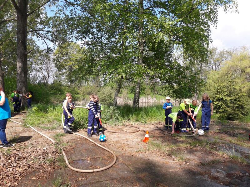 Mit Unterstützung der Hornhäuser Feuerwehr wurden die Schläuche ausgerollt und die Kinder konnten mit Strahlrohren und ordentlich Wasser, verschiedene Übungen absolvieren. So wurden auch spielerisch die Geräte wie Schläuche, Verteiler, Strahlrohre, die zur Wasserförderung dienen genau erklärt. Am Ende der Ausbildung wurde es noch einmal so richtig nass, aber nicht nur die Kinder sondern auch die Betreuer mussten eher unfreiwillig eine kleine Dusche nehmen. Aber Spaß hatte die gesamte Truppe an dieser praktischen Ausbildung bei sommerlichen Temperaturen.