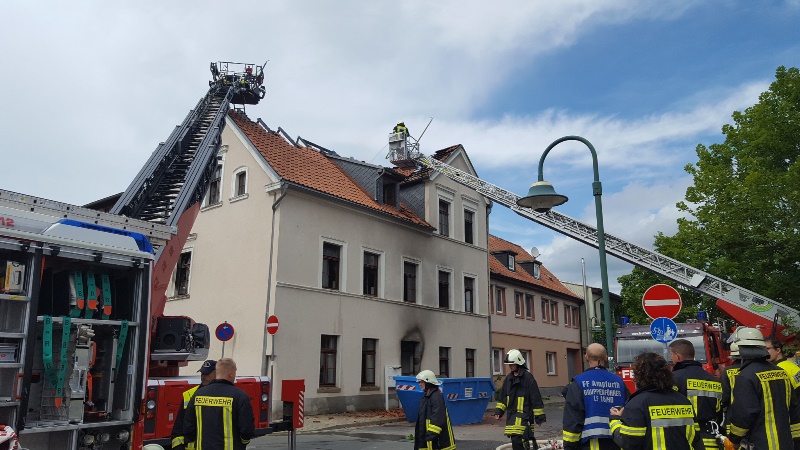 Anwohner und Passanten konnten bereits aus der 1.Etage eine Mutter mit ihren beiden Kindern retten. Sie wurden vom Rettungsdienst ins Krankenhaus gebracht. Der Angriffstrupp ging sofort mit einem C-Rohr in das Gebäude vor. In der Zwischenzeit waren das TLF, sowie die Wehren aus Schermcke und Ampfurth ebenfalls an der Einsatzstelle eingetroffen. Während sich weitere Trupps für den Innenangriff ausrüsteten, zündete der Brand im Treppenhaus durch. Der Trupp im Inneren des Gebäudes, konnte dieses noch rechtzeitig verlassen.