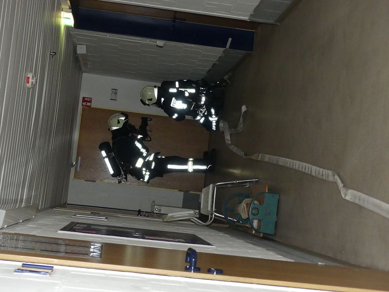 So wurde angenommen, dass es im Keller zu einer Rauchentwicklung gekommen ist und der Hausmeister in einem verqualmten Raum eingeschlossen ist. Weiterhin befand sich eine Person auf der Rückseite auf einem Balkon und wartete auf Rettung. Der Angriffstrupp vom HLF begab sich über das Treppenhaus zur Rettung, der im Keller vermissten Person vor. Weitere Einsatzkräfte bauten in der Zwischenzeit eine Löschwasserversorgung zur Einspeisung in die Steigleitung auf. Ursprünglich war geplant, die Person vom Balkon über die Drehleiter zu retten, aber kurz nach Beginn der Ausbildung wurde diese durch die ILS zu einem Brandeinsatz nach Wulferstedt alarmiert.