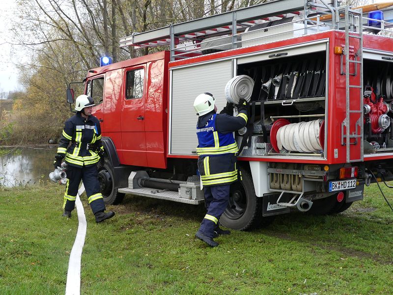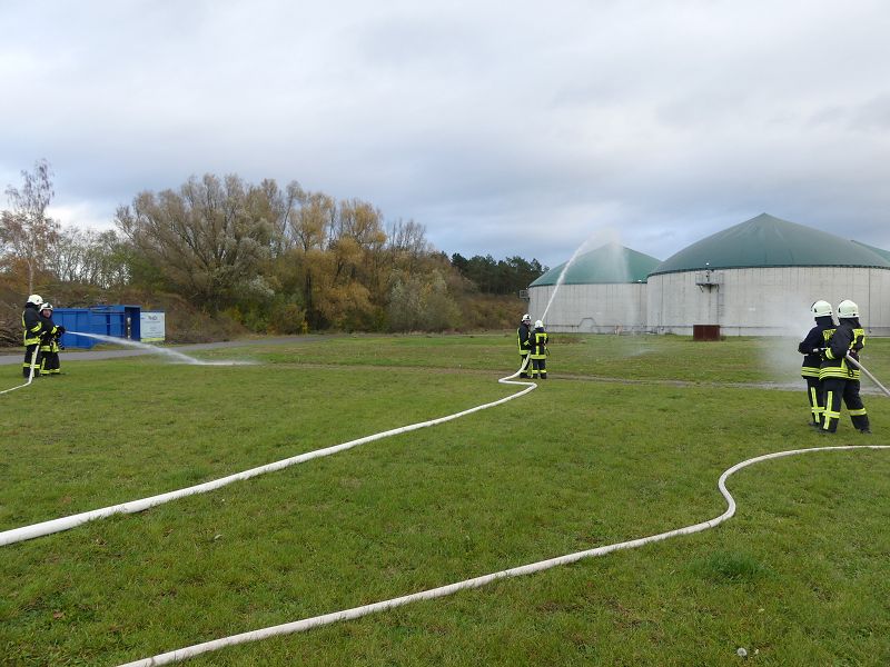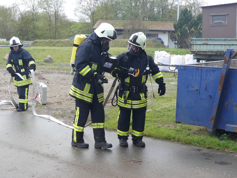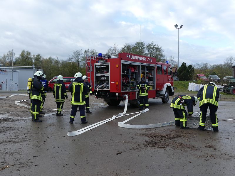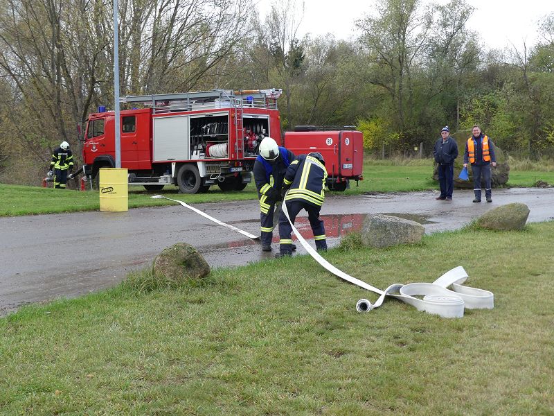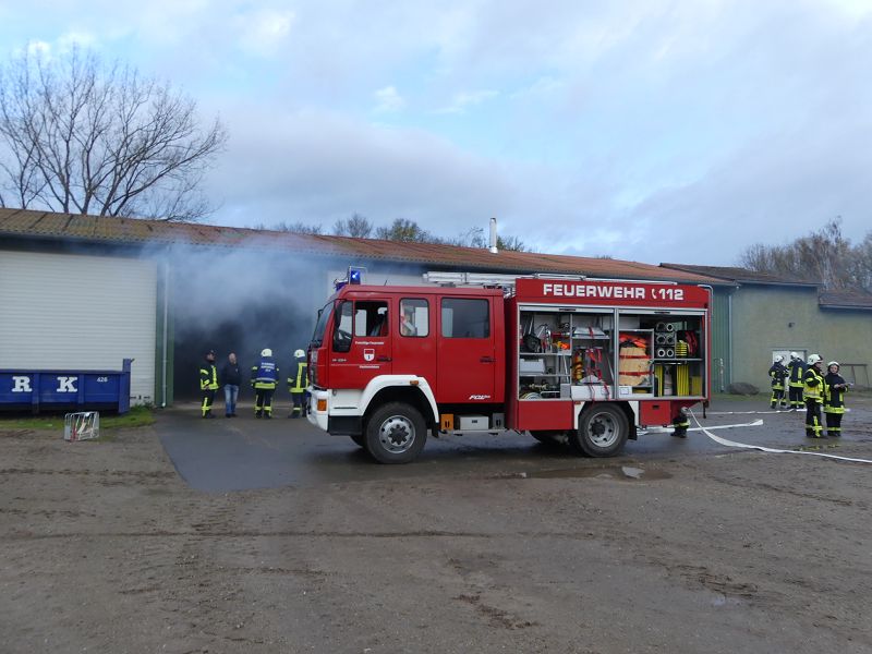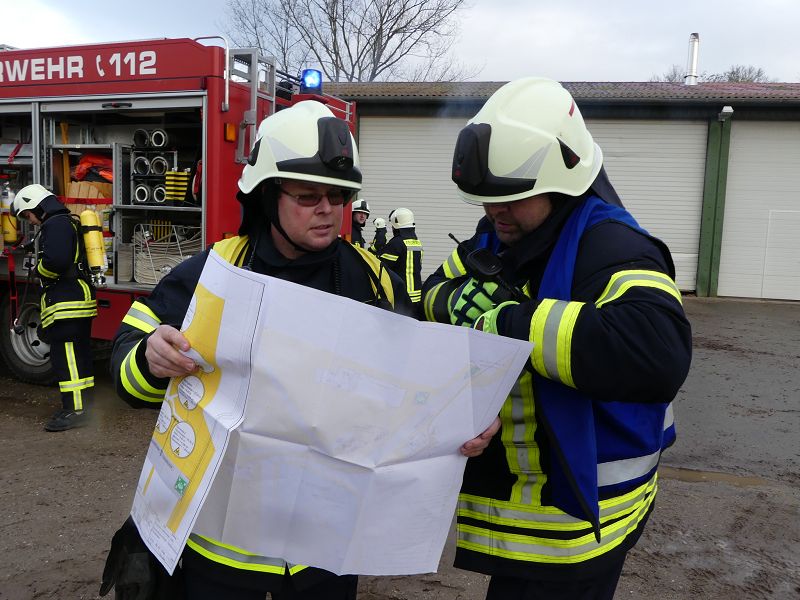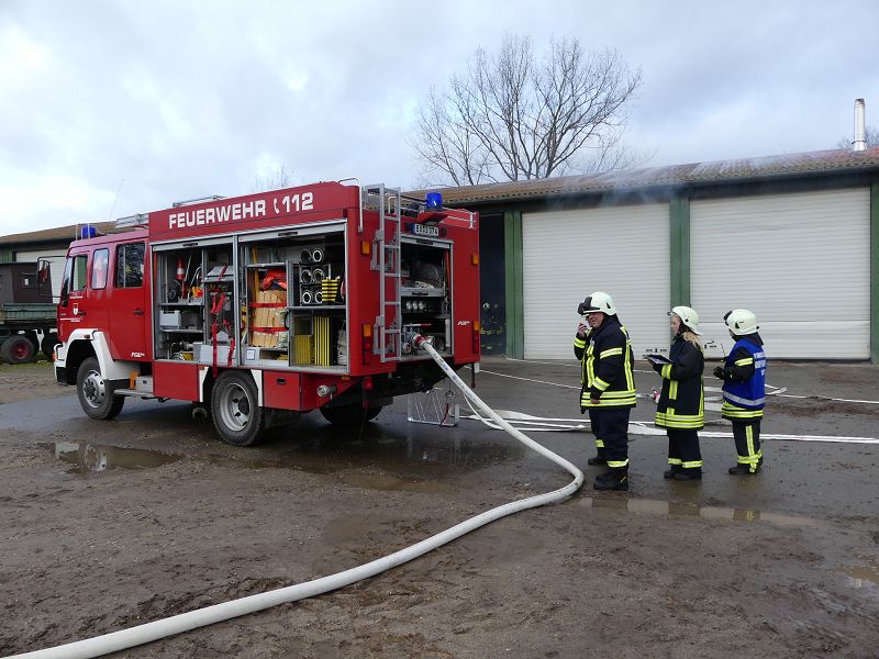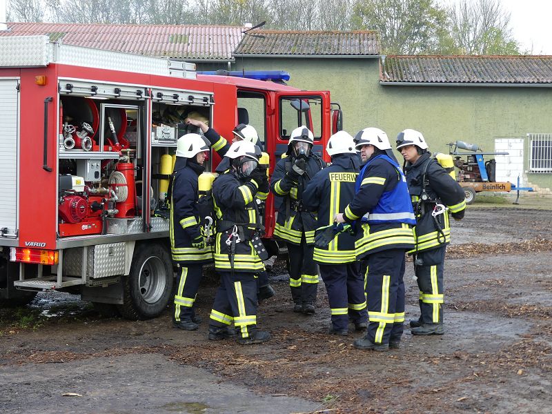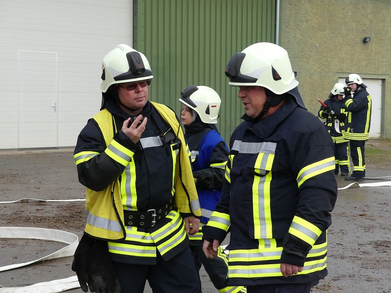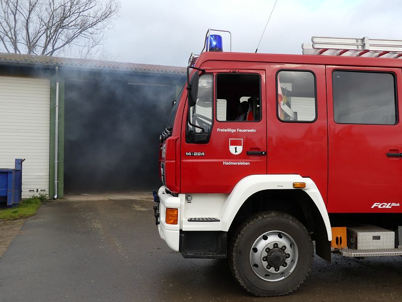 Dies war der Auftakt einer vom Hadmerslebens Ortswehrleiter Hans-Joachim Hempel geplanter Einsatzübung. So wurden die ersten Schläuche ausgerollt und eine Löschwasserversorgung vom Löschteich aufgebaut. Währenddessen rüsteten sich die Kameraden mit Atemschutzgeräten aus und machten sich in der verqualmten Lagerhalle auf der Suche nach der vermissten Person. Dieser konnte später im Außenbereich gefunden werden. Nach rund 45 Minuten konnte die Einsatzübung erfolgreich beendet werden. In der Auswertung lobte Ortswehrleiter Hempel die gute Zusammenarbeit der beiden Wehren. Die Einsatzübung soll zu einer Verbesserung des Ausbildungsstandes beitragen, sowie sollen die erworbenen Kenntnisse umgesetzt werden.