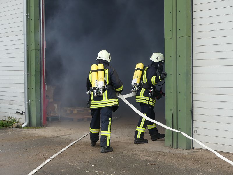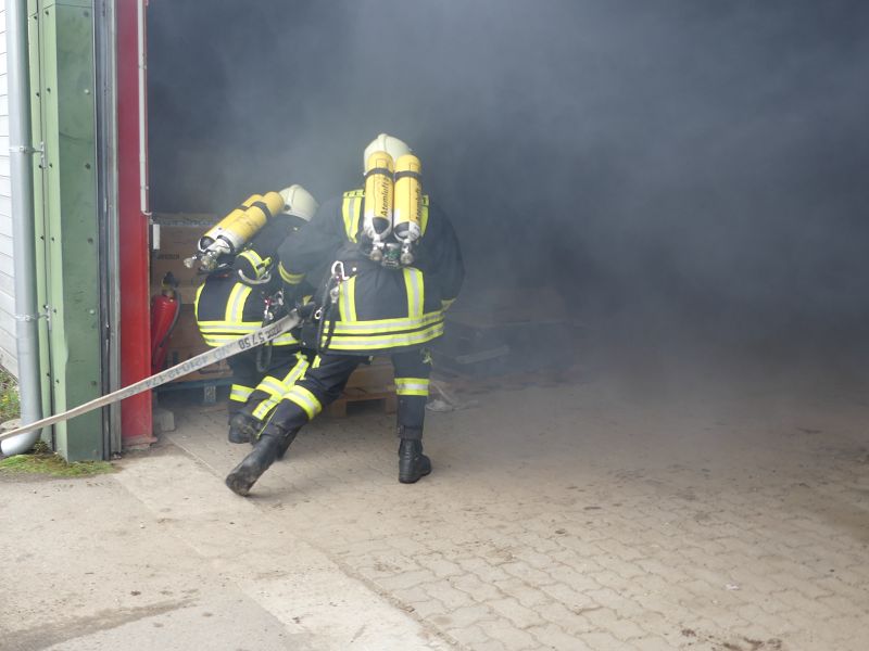 Ersten Meldungen zu Folge, sollten sich noch Personen in der Lagerhalle aufhalten. Die ersten Einsatzkräfte um Einsatzleiter Christian Bardick, wurden von Betriebsleiter Sebastian Schrader in Empfang genommen und über die Ereignisse auf dem Gelände informiert.
