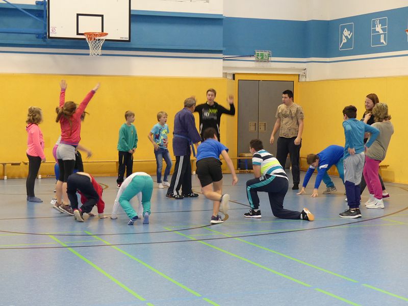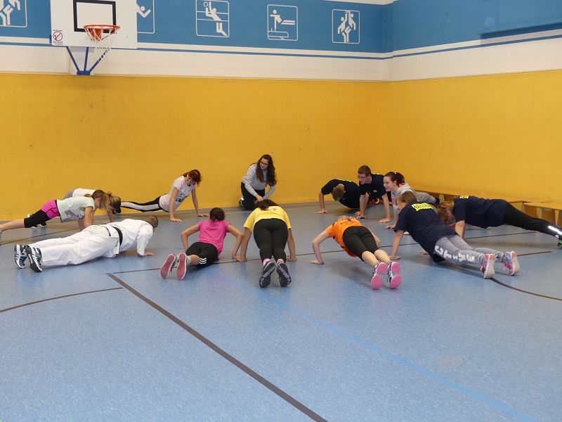 Die rund 50 Kinder und Jugendliche wurden in 3 Gruppen aufgeteilt. Im theoretischen Teil der Ausbildung ging es u.a. um den Notwehr Paragraphen, aber auch über das Erkennen von einer Gefahrensituation. Ziel ist es, dass die Kinder ein Selbstbewussteres Auftreten erlangen. Jeder weiß ja, dass leider im Privat und Berufsleben die Gewaltbereitschaft in den letzten Jahren mehr und mehr zugenommen hat. Im praktischen Teil wurden dann verschiedene Übungen absolviert wie z.Bsp. die Armbefreiung, Befreiung aus Umklammerung, Abwehr von Faustschlägen und immer wieder ein sicheres Auftreten. So verging der Vormittag wie im Fluge.
