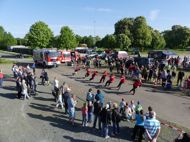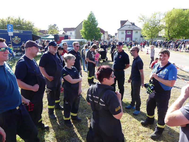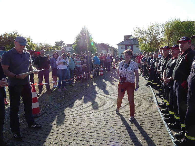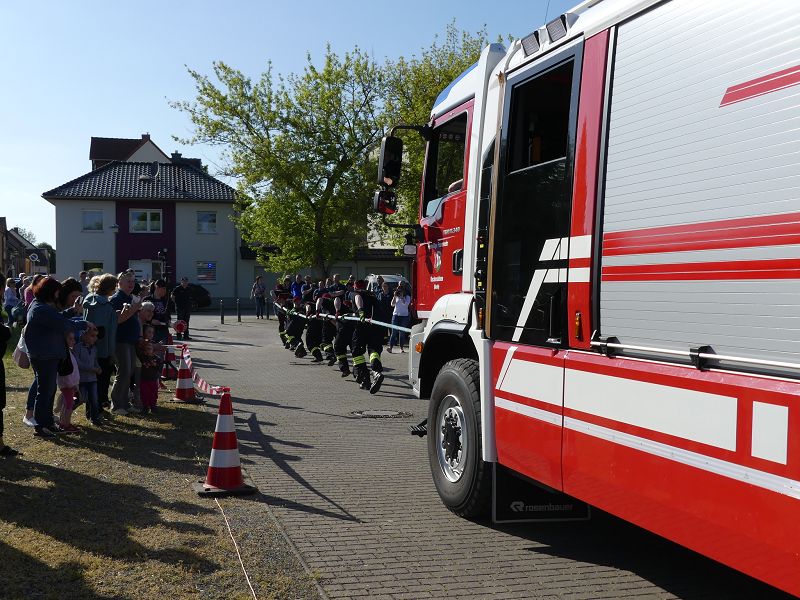 Als erstes startete die Ortsfeuerwehr Hornhausen. 16:27 sec, war erstmal das Maß für alle anderen Gruppen. Gleich danach setzte die Ortsfeuerwehr Schermcke eine neue Bestzeit mit 15:93 sec. Die erste Mannschaft der Oschersleber Feuerwehr konnte im ersten Durchlauf die Zeit noch einmal unterbieten und schaffte in 15:62 sec, das Tanklöschfahrzeug über die Distanz zu ziehen. Weitere Mannschaften der Feuerwehren aus Altbrandsleben, Ausleben, Neindorf/ Männer, Oschersleben 2. Mannschaft, sowie der Partnerwehr aus Schöningen lieferten sich ebenfalls harte Duelle und lagen nur knapp unter den Bestzeiten.