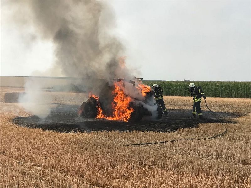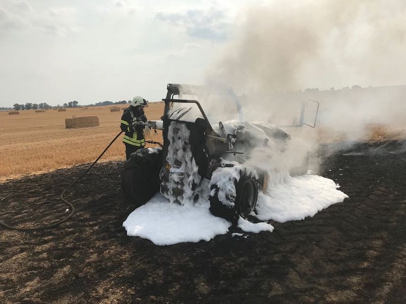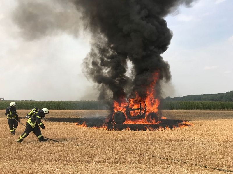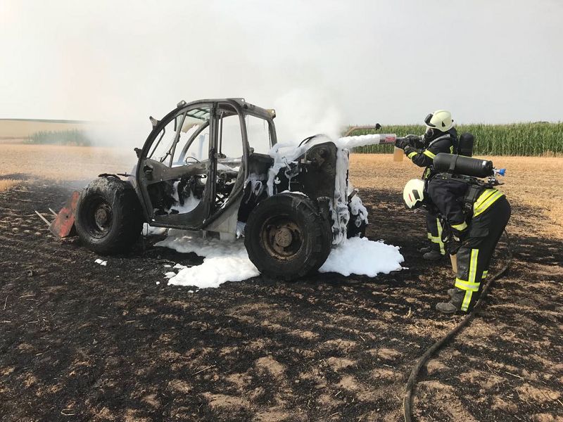 Gemeldet wurde der Brand eines Teleskopladers, auf einem Feld im Bereich des Ortsteils Andersleben. Bei Ankunft der Feuerwehr, stand das Fahrzeug in Vollbrand. Nur unter Atemschutz konnte der brennende Teleskoplader abgelöscht werden. Hierfür kam auch Schaum zum Einsatz. Ein Übergreifen auf weitere Felder konnte verhindert werden. Verletzt wurde in beiden Fällen niemand.