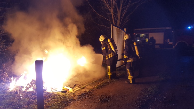 Um kurz nach 21.00 Uhr alarmierte die Rettungsleitstelle zu einem Containerbrand in die Wochenendsiedlung Bürgerpark. Umgehend besetzten die in der Feuerwache zur Silvesterfeier anwesenden Kameraden den ELW und das TLF und waren kurz nach der Alarmierung vor Ort. Der Angriffstrupp ging unter Atemschutz zur Brandbekämpfung vor und löschte die beiden Müllbehälter ab. Auch die Polizei war Ort und ermittelt zur Brandursache.