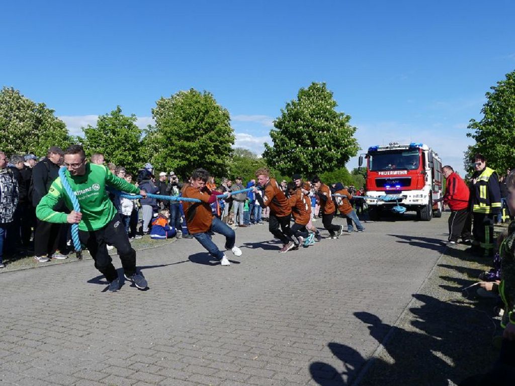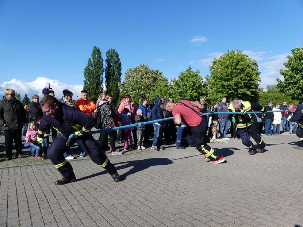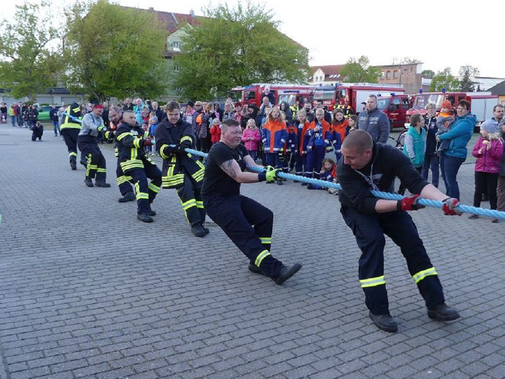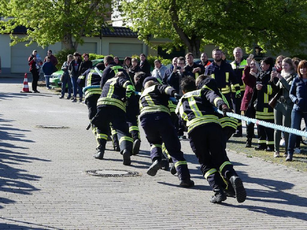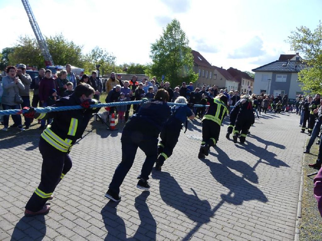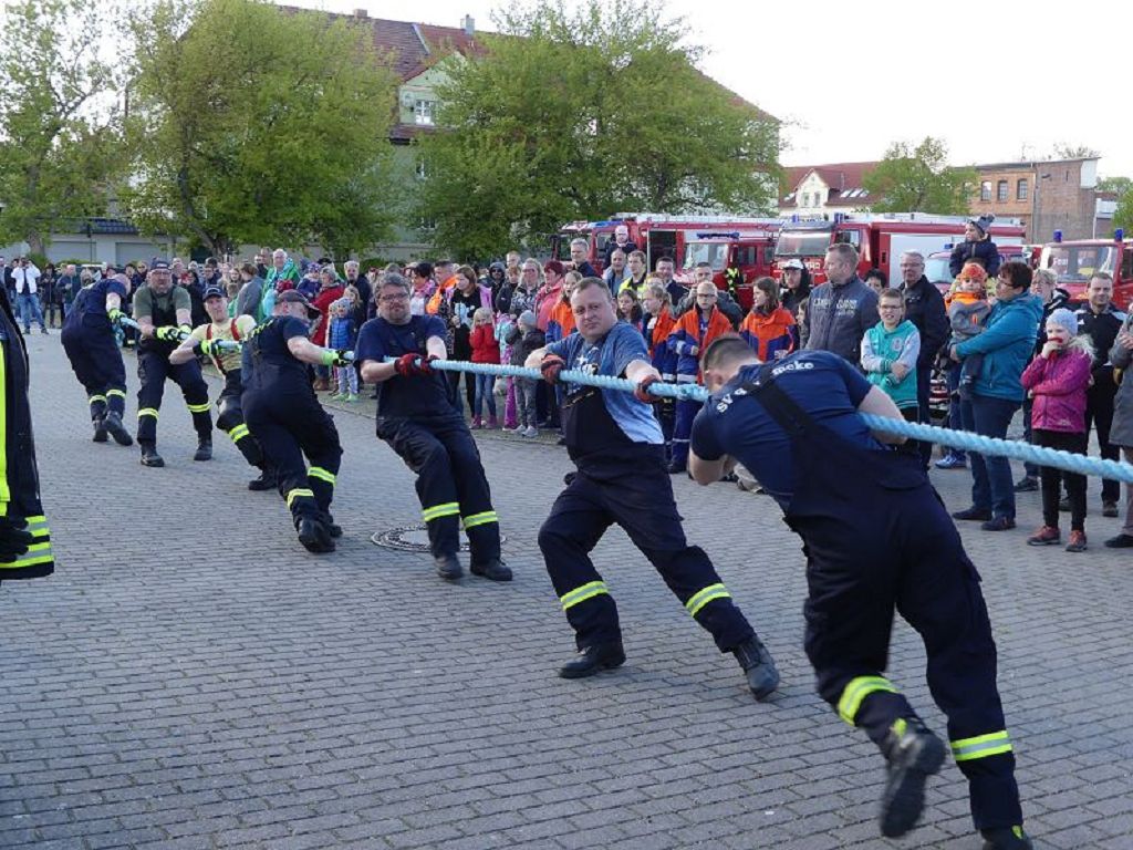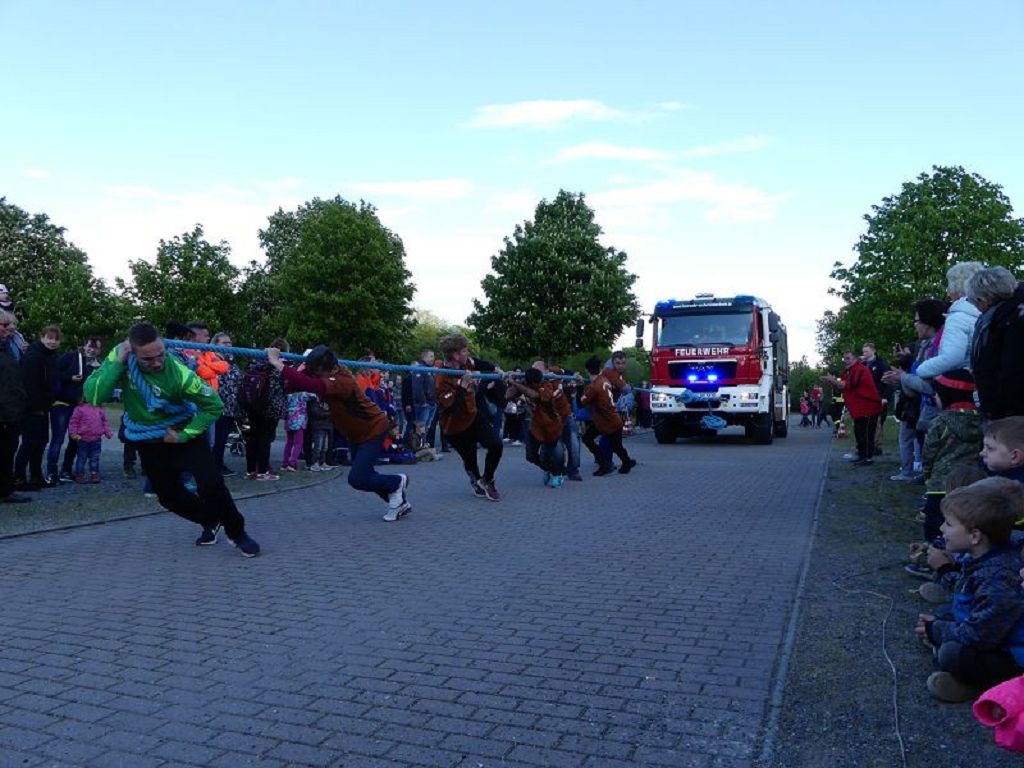 6 Mannschaften nahmen daran teil, darunter auch eine Frauenmannschaft. Auch diesmal galt es das 18 Tonnen schwere Tanklöschfahrzeug über eine Distanz von 25 Metern zu ziehen. Die Startfolge wurde ausgelost und so begannen als erstes die Lokalmatadoren aus Oschersleben. Mit einer Zeit von 15.87 sec., schafften sie auch gleich die Bestzeit im ersten Durchgang. Dicht gefolgt von den Ampfurther Kameraden, die das Fahrzeug in 16.12 sec. zogen. Die Sieger des letzten Jahres, die Feuerwehr Schermcke, kamen in 16.29 sec. ins Ziel. Aber auch die Hornhäuser Kameraden, sowie die Frauengruppe der Feuerwehr Neindorf und die Mannschaft des VFB Oschersleben schafften schnelle Zeiten. Nach einer kleinen Pause fanden sich bei tollem Wetter, viele Besucher an der „Rennstrecke“ ein und feuerten die Mannschaften im 2.Durchgang lautstark an. Kamerad Matthias Germer führte Redegewand durch den Wettkampf. So starten die Mannschaften in umgekehrter Reihenfolge. Die Bestzeit aus dem ersten Durchgang konnten aber weder der VFB Oschersleben, noch die Frauengruppe oder die Feuerwehr Hornhausen unterbieten. Dann kam aber die Feuerwehr Schermcke. Auf dem 3.Platz nach dem ersten Durchgang gelegen, schafften sie nun eine Superzeit von 15.43 sec. Dies war am Ende auch die beste Zeit des Tages und so sicherten sich die Kameraden aus Schermcke erneut den 1.Platz und konnten den Wanderpokal wieder mit nach Hause nehmen. Bürgermeister Benjamin Kanngießer sponserte auch in diesem Jahr wieder ein Fass Bier für die Siegermannschaft. Glückwunsch an den verdienten Sieger. Aber auch ein Dankeschön an alle anderen teilnehmenden Mannschaften. Nach dem Tanker Pulling wurde das große Maifeuer entzündet. In diesem Jahr gab es auch Live Musik. Manfred “Manne“ Becker unterhielt die vielen Zuhörer mit seinem großen Repertoire. Auch hierfür ein großes Dankeschön. So wurde ausgelassen, bis in die Nacht auch in Oschersleben der Mai begrüßt. Feuerwehrfördervereinsvorsitzender Heiko Schinke möchte sich ganz herzlich bei allen Helferinnen und Helfern, sowie allen Unterstützern recht herzlich bedanken. Auf ein Neues im Jahr 2020.