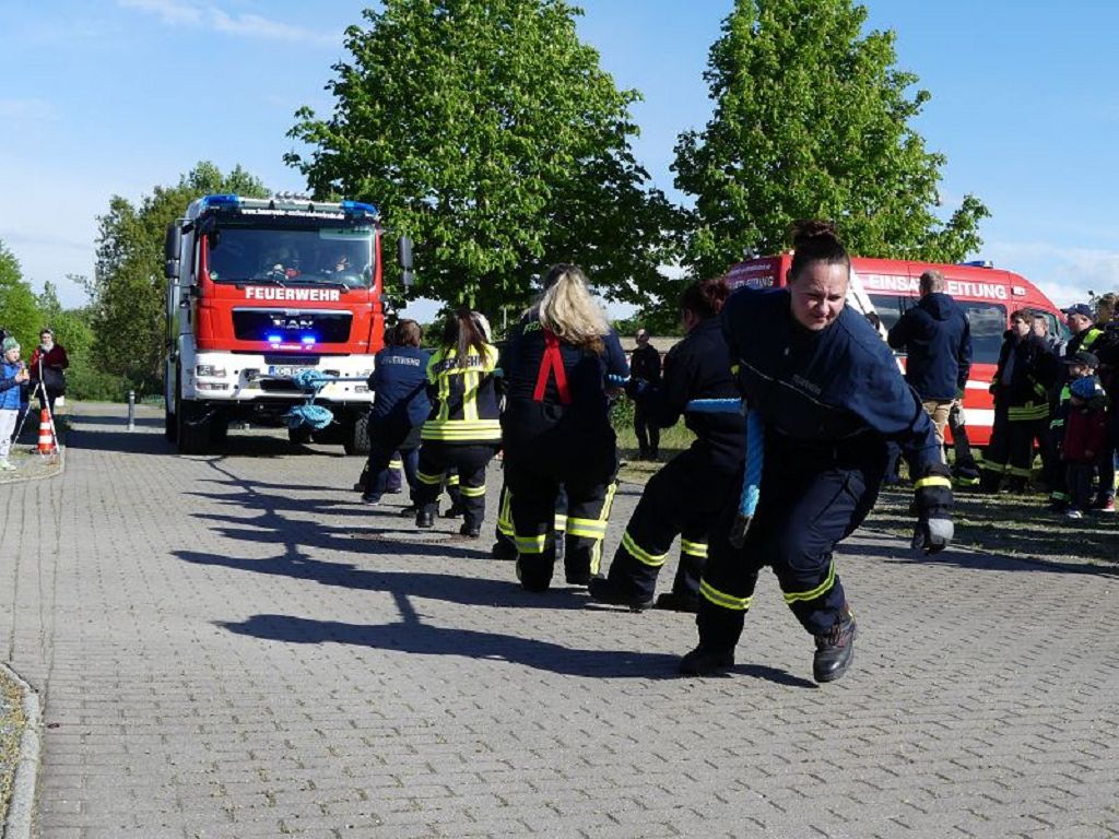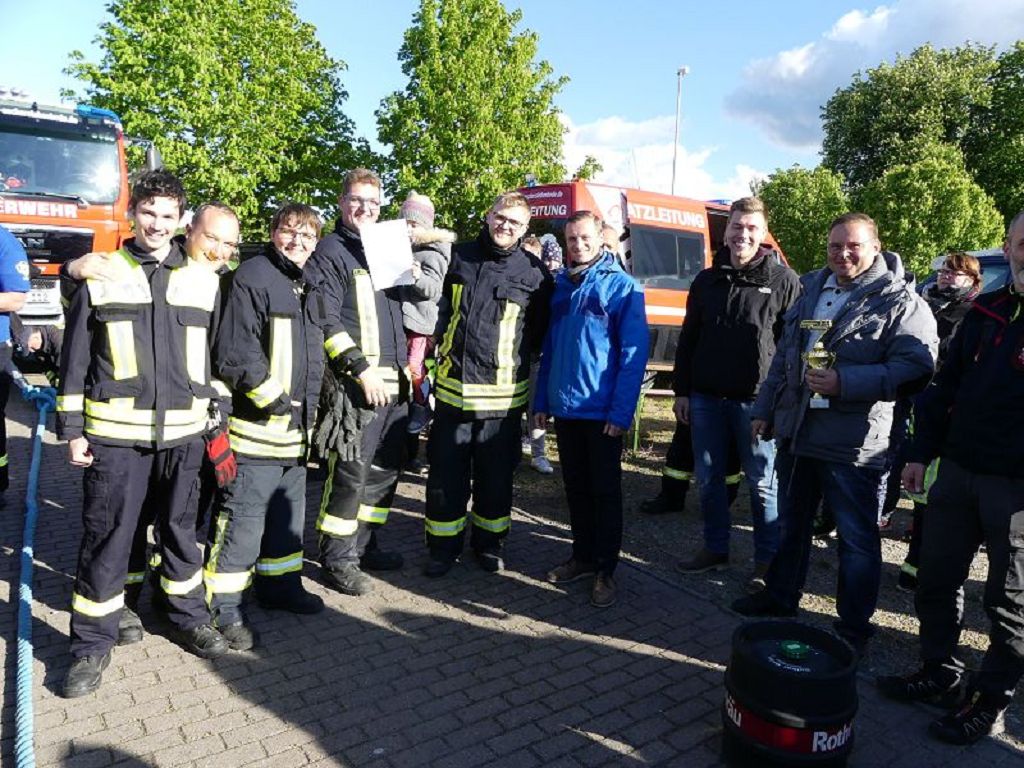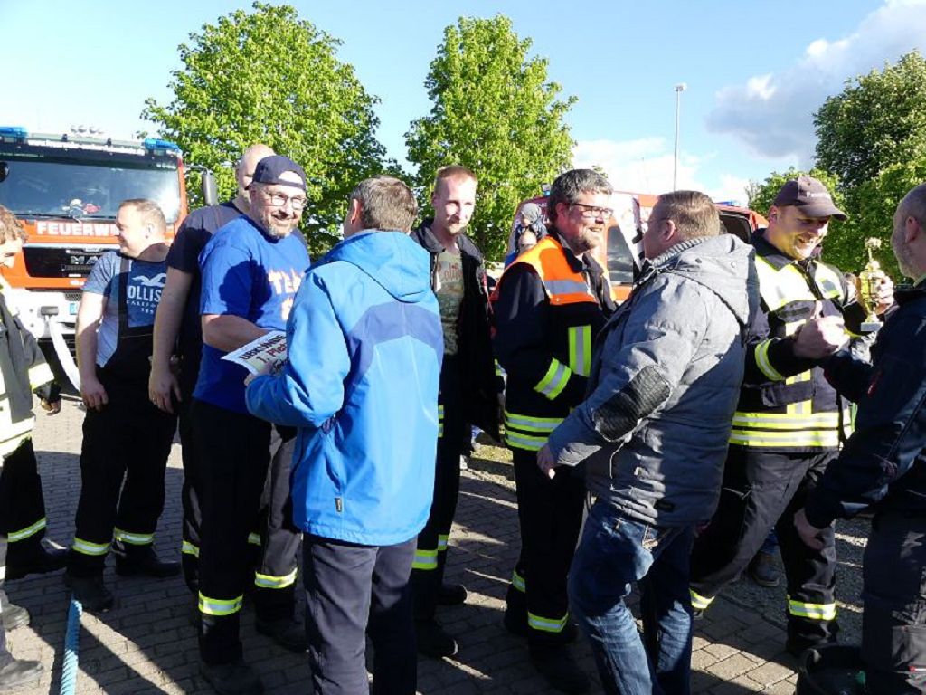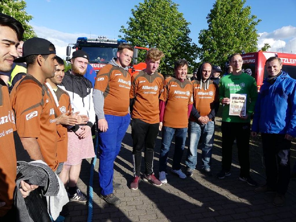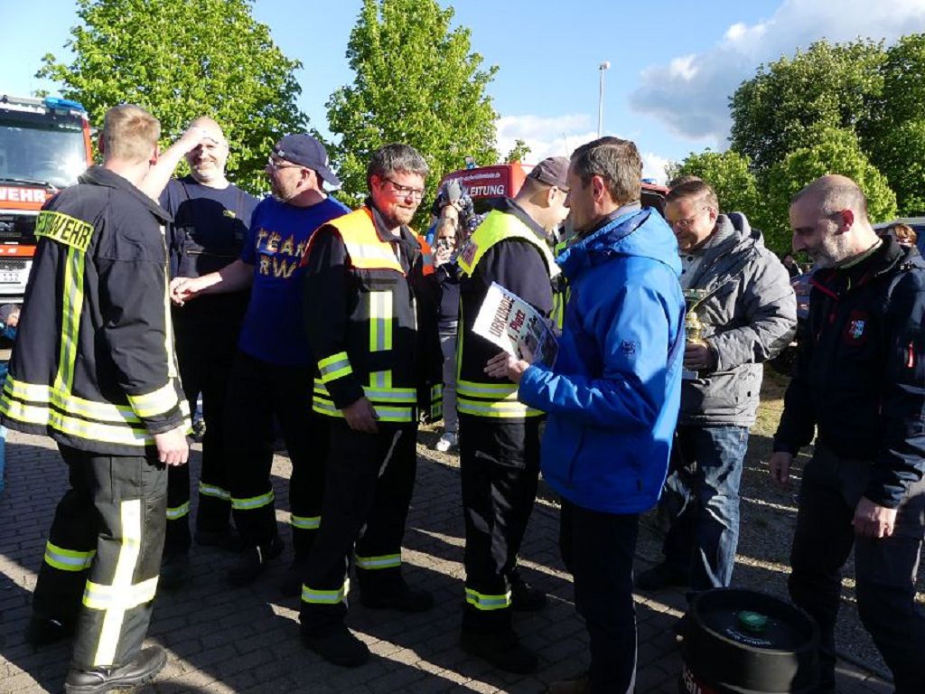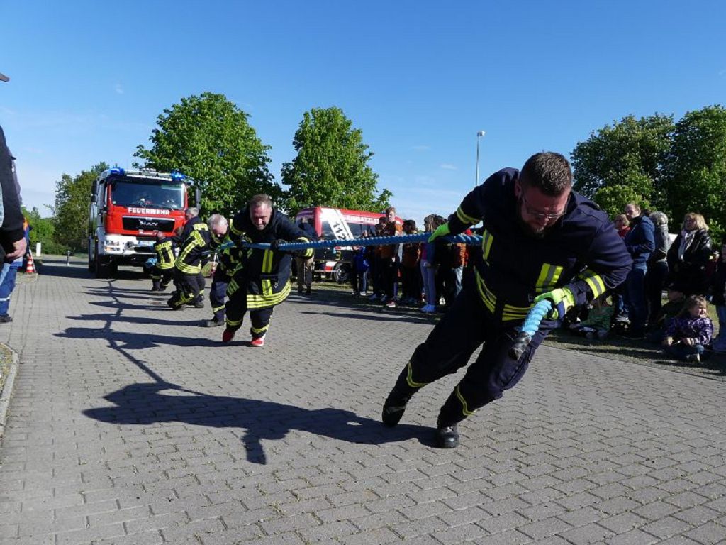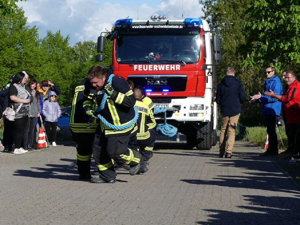 6 Mannschaften nahmen daran teil, darunter auch eine Frauenmannschaft. Auch diesmal galt es das 18 Tonnen schwere Tanklöschfahrzeug über eine Distanz von 25 Metern zu ziehen. Die Startfolge wurde ausgelost und so begannen als erstes die Lokalmatadoren aus Oschersleben. Mit einer Zeit von 15.87 sec., schafften sie auch gleich die Bestzeit im ersten Durchgang. Dicht gefolgt von den Ampfurther Kameraden, die das Fahrzeug in 16.12 sec. zogen. Die Sieger des letzten Jahres, die Feuerwehr Schermcke, kamen in 16.29 sec. ins Ziel. Aber auch die Hornhäuser Kameraden, sowie die Frauengruppe der Feuerwehr Neindorf und die Mannschaft des VFB Oschersleben schafften schnelle Zeiten. Nach einer kleinen Pause fanden sich bei tollem Wetter, viele Besucher an der „Rennstrecke“ ein und feuerten die Mannschaften im 2.Durchgang lautstark an. Kamerad Matthias Germer führte Redegewand durch den Wettkampf. So starten die Mannschaften in umgekehrter Reihenfolge. Die Bestzeit aus dem ersten Durchgang konnten aber weder der VFB Oschersleben, noch die Frauengruppe oder die Feuerwehr Hornhausen unterbieten. Dann kam aber die Feuerwehr Schermcke. Auf dem 3.Platz nach dem ersten Durchgang gelegen, schafften sie nun eine Superzeit von 15.43 sec. Dies war am Ende auch die beste Zeit des Tages und so sicherten sich die Kameraden aus Schermcke erneut den 1.Platz und konnten den Wanderpokal wieder mit nach Hause nehmen. Bürgermeister Benjamin Kanngießer sponserte auch in diesem Jahr wieder ein Fass Bier für die Siegermannschaft. Glückwunsch an den verdienten Sieger. Aber auch ein Dankeschön an alle anderen teilnehmenden Mannschaften. Nach dem Tanker Pulling wurde das große Maifeuer entzündet. In diesem Jahr gab es auch Live Musik. Manfred “Manne“ Becker unterhielt die vielen Zuhörer mit seinem großen Repertoire. Auch hierfür ein großes Dankeschön. So wurde ausgelassen, bis in die Nacht auch in Oschersleben der Mai begrüßt. Feuerwehrfördervereinsvorsitzender Heiko Schinke möchte sich ganz herzlich bei allen Helferinnen und Helfern, sowie allen Unterstützern recht herzlich bedanken. Auf ein Neues im Jahr 2020.