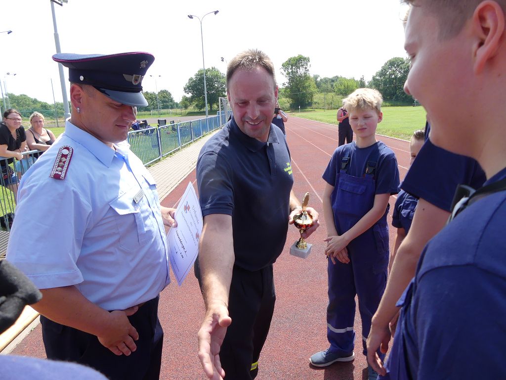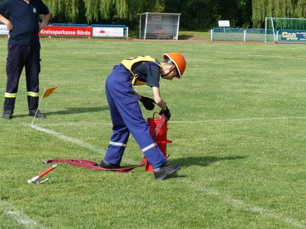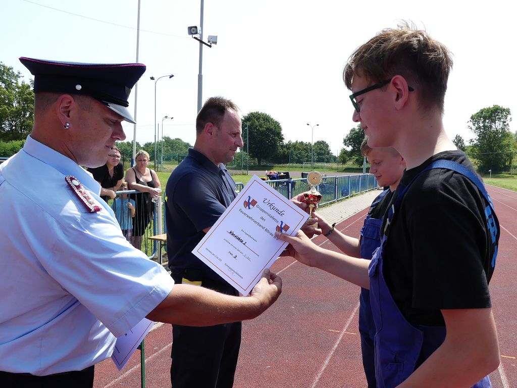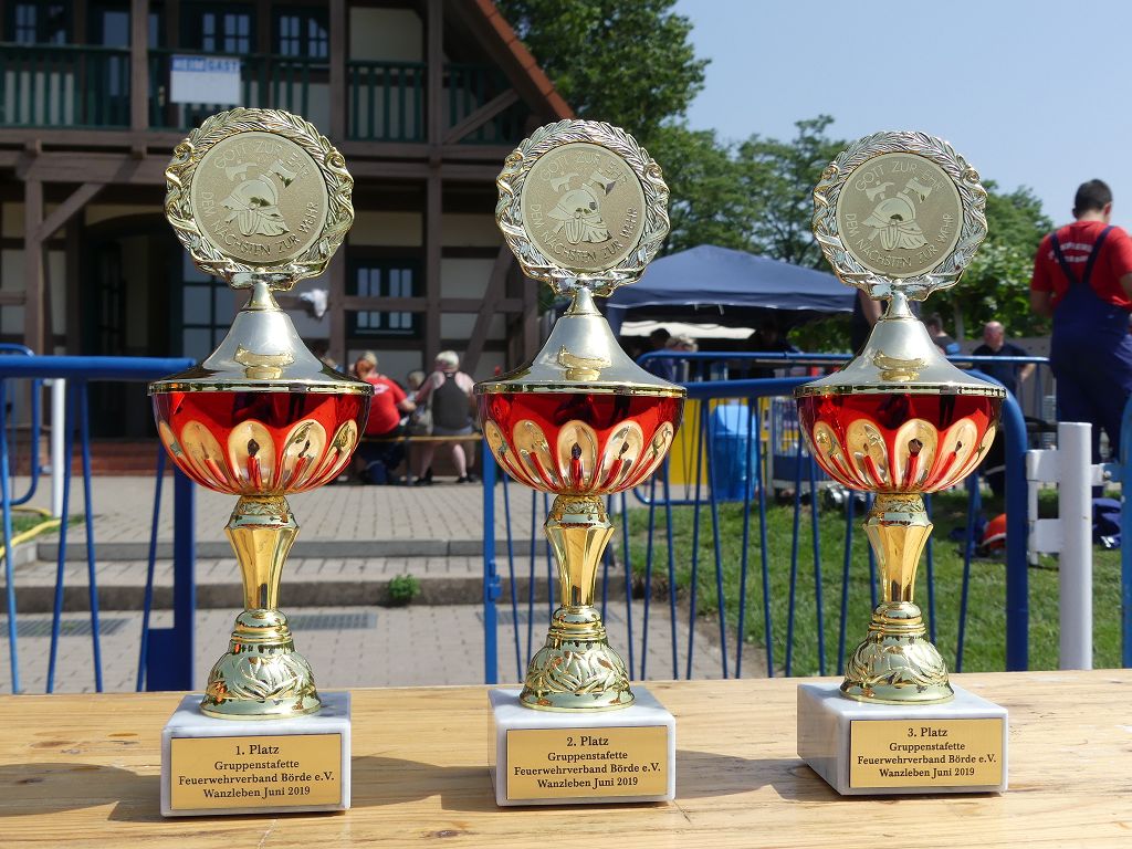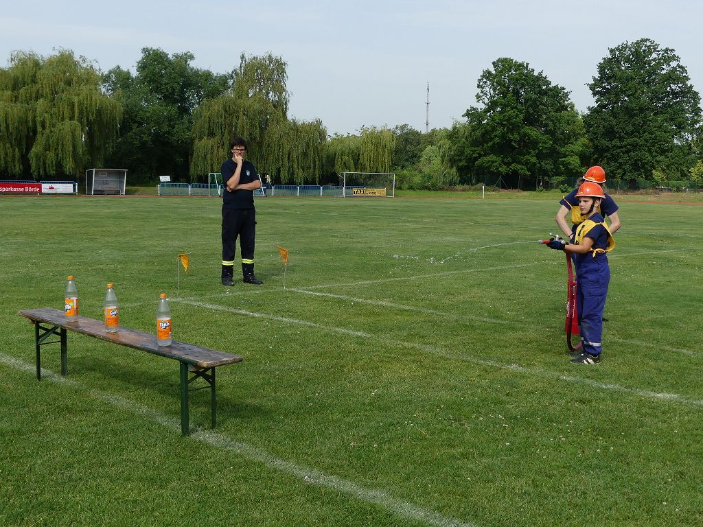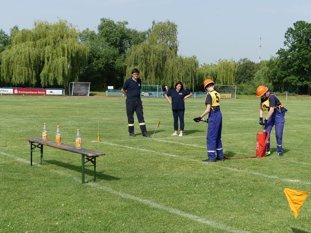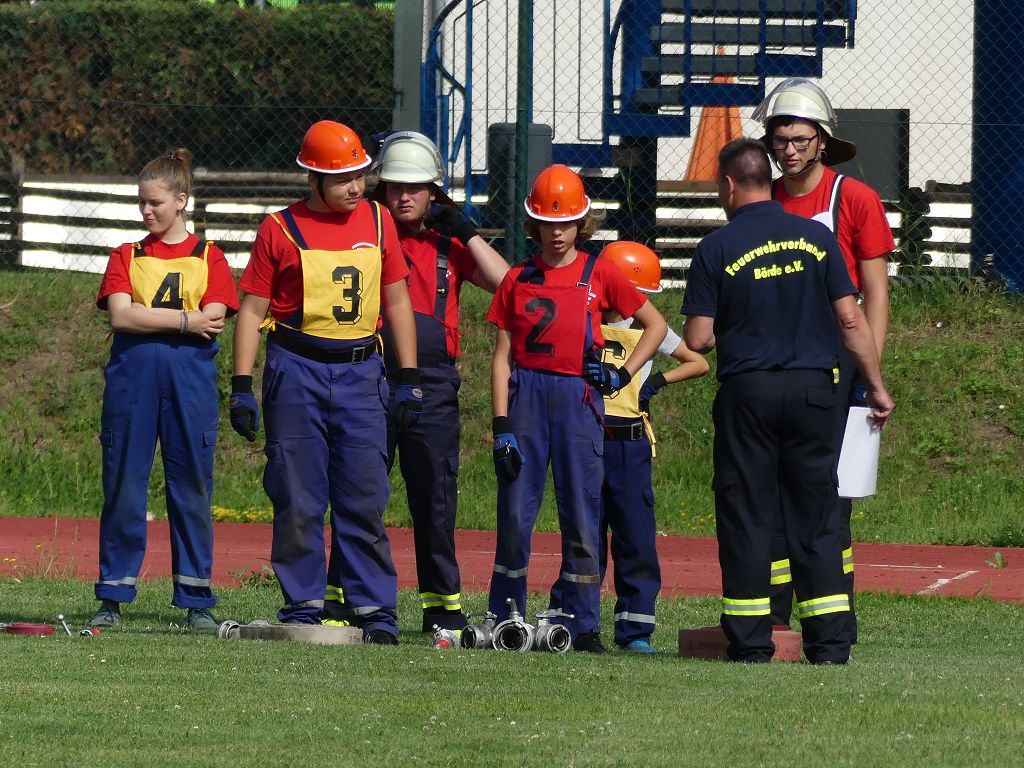 wobei feuerwehrtechnische Aufgaben nach Zeit überwunden werden müssen. Fachbereichsleiter Sandro Schröder konnte am Samstag im Wanzleber Bördestadion, 9 Mannschaften und folgende Gäste begrüßen: Landtagsabgeordnete Silke Schindler, Ordnungsamtsleiter der Stadt Wanzleben Kai Pluntke, den Bürgermeister des Sülzetals Jörg Methner, Wanzlebens Stadtwehrleiter Burkard Wegner, den Vorsitzenden des Feuerwehrverbandes Börde e.V. Harald Hinz, sowie den Verbandsjugendfeuerwehrwart Thomas Ehrhardt. Alle Gäste wünschten den Teilnehmern viel Erfolg beim Wettkampf. Um kurz nach 09.00 Uhr ging dann die erste Mannschaft an den Start. Nach dem Startkommando laufen 2 Jugendfeuerwehrmitglieder zur Verteilerlinie und verbinden einen B-Schlauch mit einem Verteiler. Ein Mitglied läuft zurück und schlägt den nächsten Läufer an, welcher dann mit einem C-Schlauch sich auf dem Weg zum Verteiler macht. Beide Mitglieder laufen dann zum anderen Ende des Schlauches und kuppeln ein Strahlrohr an. Nach dem Durchkriechen einer Hürde wird der nächste Läufer an der Startlinie abgeklatscht. Dieser muss dann 3 Knoten an einer 50 m entfernten Hürde binden und im Anschluss zur Startlinie zurücklaufen. Für 2 weitere Läufer geht es dann im Laufschritt zur Kübelspritze. Während ein Mitglied, Schlauch und Strahlrohr an der Kübelspritze ankuppelt, umrundet das 2. Mitglied diese und schlägt den Läufer am Strahlrohr ab. Dieser läuft zur Kübelspritze und bedient diese. Im Ziel galt es leere Flaschen mit dem Wasserstrahl umzuschießen. Der Strahlrohrführer muss dann zurück zur Startlinie laufen, um den Wettkampf zu beenden. Jede Mannschaft hatte 2 Läufe zu absolvieren. Gegen Mittag begann das Rechnen im Wettkampfbüro. So wurde aus den Laufzeiten und Fehlerpunkten, die Siegermannschaft ermittelt. Fachbereichsleiter Sandro Schröder und der stellvertretende Verbandsjugendfeuerwehrwart Markus Skurk übernahmen dann die Siegerehrung. Die 1.Mannschaft des Lokalmatadoren aus Wanzleben hatte am Ende die Nase vorn und konnte den Siegelpokal in Empfang nehmen. Den 2.Platz erreichte die Jugendfeuerwehr Osterweddingen 2, dicht gefolgt von der Gruppe Wanzleben 2. Verlierer gab es aber nicht, denn alle Gruppen meisterten den Parcours bei den sommerlichen Temperaturen mit Bravour und bekamen hierfür viel Lob. Ein großes Dankeschön richtete Sandro Schröder an die Stadt Wanzleben für die Bereitstellung des Sportplatzes, an den Förderverein der Feuerwehr Wanzleben für die Versorgung mit Speisen und Getränke, sowie an alle Wertungsrichter und Helferinnen und Helfer, sowie natürlich an alle teilnehmenden Jugendfeuerwehren. Herzlichen Glückwunsch noch einmal an den Verbandsmeister 2019.