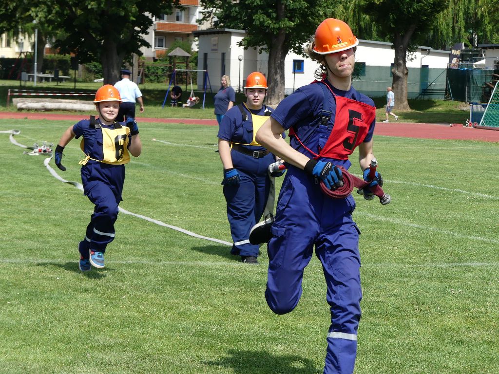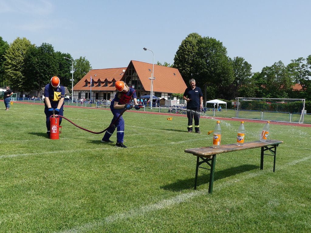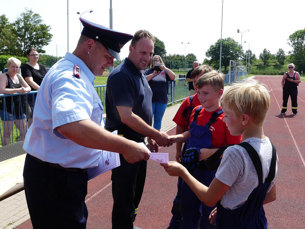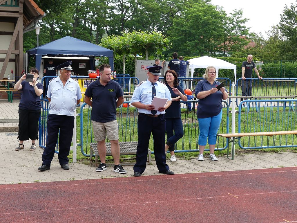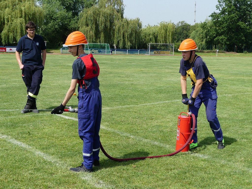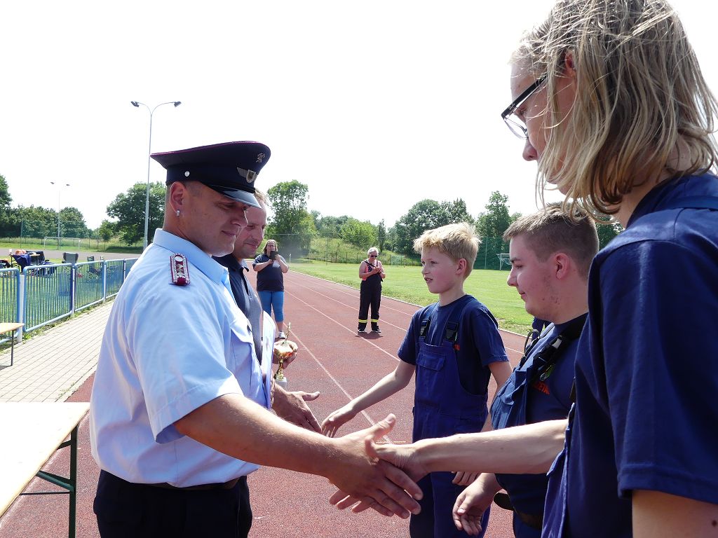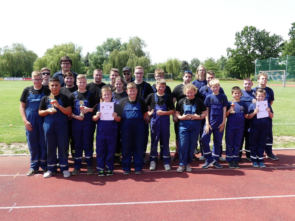wobei feuerwehrtechnische Aufgaben nach Zeit überwunden werden müssen. Fachbereichsleiter Sandro Schröder konnte am Samstag im Wanzleber Bördestadion, 9 Mannschaften und folgende Gäste begrüßen: Landtagsabgeordnete Silke Schindler, Ordnungsamtsleiter der Stadt Wanzleben Kai Pluntke, den Bürgermeister des Sülzetals Jörg Methner, Wanzlebens Stadtwehrleiter Burkard Wegner, den Vorsitzenden des Feuerwehrverbandes Börde e.V. Harald Hinz, sowie den Verbandsjugendfeuerwehrwart Thomas Ehrhardt. Alle Gäste wünschten den Teilnehmern viel Erfolg beim Wettkampf. Um kurz nach 09.00 Uhr ging dann die erste Mannschaft an den Start. Nach dem Startkommando laufen 2 Jugendfeuerwehrmitglieder zur Verteilerlinie und verbinden einen B-Schlauch mit einem Verteiler. Ein Mitglied läuft zurück und schlägt den nächsten Läufer an, welcher dann mit einem C-Schlauch sich auf dem Weg zum Verteiler macht. Beide Mitglieder laufen dann zum anderen Ende des Schlauches und kuppeln ein Strahlrohr an. Nach dem Durchkriechen einer Hürde wird der nächste Läufer an der Startlinie abgeklatscht. Dieser muss dann 3 Knoten an einer 50 m entfernten Hürde binden und im Anschluss zur Startlinie zurücklaufen. Für 2 weitere Läufer geht es dann im Laufschritt zur Kübelspritze. Während ein Mitglied, Schlauch und Strahlrohr an der Kübelspritze ankuppelt, umrundet das 2. Mitglied diese und schlägt den Läufer am Strahlrohr ab. Dieser läuft zur Kübelspritze und bedient diese. Im Ziel galt es leere Flaschen mit dem Wasserstrahl umzuschießen. Der Strahlrohrführer muss dann zurück zur Startlinie laufen, um den Wettkampf zu beenden. Jede Mannschaft hatte 2 Läufe zu absolvieren. Gegen Mittag begann das Rechnen im Wettkampfbüro. So wurde aus den Laufzeiten und Fehlerpunkten, die Siegermannschaft ermittelt. Fachbereichsleiter Sandro Schröder und der stellvertretende Verbandsjugendfeuerwehrwart Markus Skurk übernahmen dann die Siegerehrung. Die 1.Mannschaft des Lokalmatadoren aus Wanzleben hatte am Ende die Nase vorn und konnte den Siegelpokal in Empfang nehmen. Den 2.Platz erreichte die Jugendfeuerwehr Osterweddingen 2, dicht gefolgt von der Gruppe Wanzleben 2. Verlierer gab es aber nicht, denn alle Gruppen meisterten den Parcours bei den sommerlichen Temperaturen mit Bravour und bekamen hierfür viel Lob. Ein großes Dankeschön richtete Sandro Schröder an die Stadt Wanzleben für die Bereitstellung des Sportplatzes, an den Förderverein der Feuerwehr Wanzleben für die Versorgung mit Speisen und Getränke, sowie an alle Wertungsrichter und Helferinnen und Helfer, sowie natürlich an alle teilnehmenden Jugendfeuerwehren. Herzlichen Glückwunsch noch einmal an den Verbandsmeister 2019.