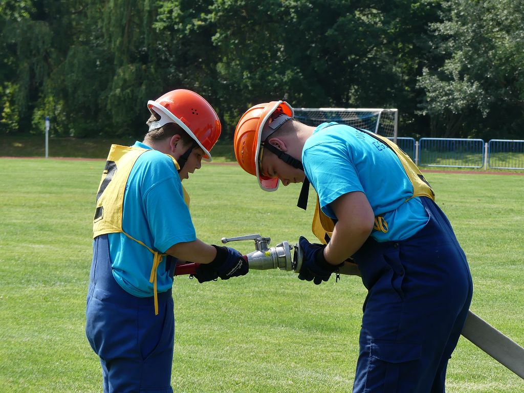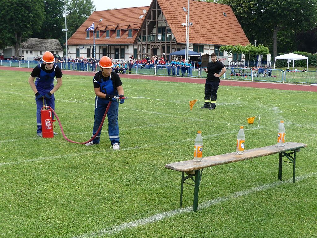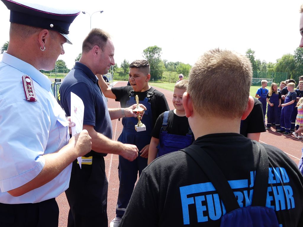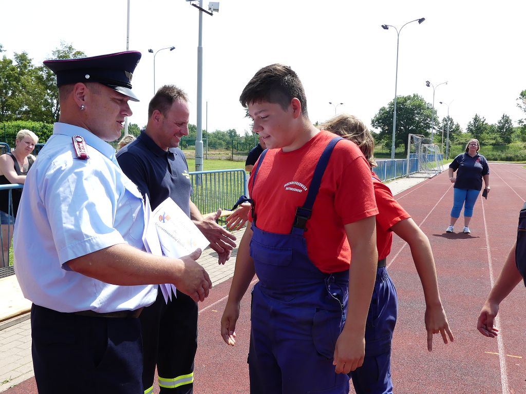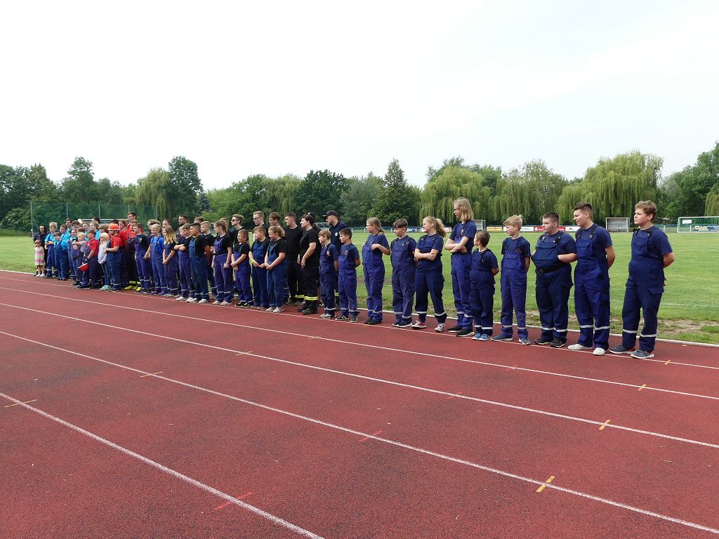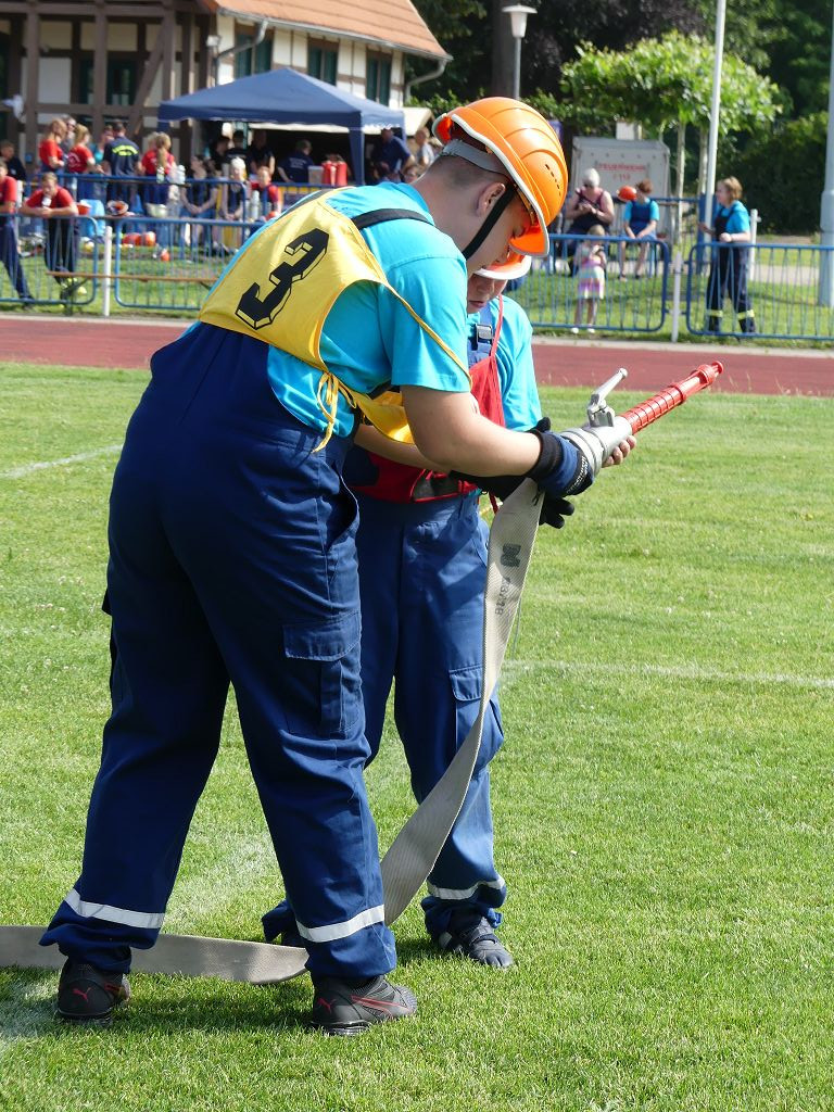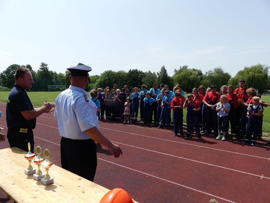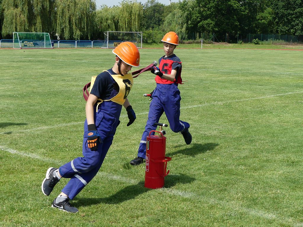 wobei feuerwehrtechnische Aufgaben nach Zeit überwunden werden müssen. Fachbereichsleiter Sandro Schröder konnte am Samstag im Wanzleber Bördestadion, 9 Mannschaften und folgende Gäste begrüßen: Landtagsabgeordnete Silke Schindler, Ordnungsamtsleiter der Stadt Wanzleben Kai Pluntke, den Bürgermeister des Sülzetals Jörg Methner, Wanzlebens Stadtwehrleiter Burkard Wegner, den Vorsitzenden des Feuerwehrverbandes Börde e.V. Harald Hinz, sowie den Verbandsjugendfeuerwehrwart Thomas Ehrhardt. Alle Gäste wünschten den Teilnehmern viel Erfolg beim Wettkampf. Um kurz nach 09.00 Uhr ging dann die erste Mannschaft an den Start. Nach dem Startkommando laufen 2 Jugendfeuerwehrmitglieder zur Verteilerlinie und verbinden einen B-Schlauch mit einem Verteiler. Ein Mitglied läuft zurück und schlägt den nächsten Läufer an, welcher dann mit einem C-Schlauch sich auf dem Weg zum Verteiler macht. Beide Mitglieder laufen dann zum anderen Ende des Schlauches und kuppeln ein Strahlrohr an. Nach dem Durchkriechen einer Hürde wird der nächste Läufer an der Startlinie abgeklatscht. Dieser muss dann 3 Knoten an einer 50 m entfernten Hürde binden und im Anschluss zur Startlinie zurücklaufen. Für 2 weitere Läufer geht es dann im Laufschritt zur Kübelspritze. Während ein Mitglied, Schlauch und Strahlrohr an der Kübelspritze ankuppelt, umrundet das 2. Mitglied diese und schlägt den Läufer am Strahlrohr ab. Dieser läuft zur Kübelspritze und bedient diese. Im Ziel galt es leere Flaschen mit dem Wasserstrahl umzuschießen. Der Strahlrohrführer muss dann zurück zur Startlinie laufen, um den Wettkampf zu beenden. Jede Mannschaft hatte 2 Läufe zu absolvieren. Gegen Mittag begann das Rechnen im Wettkampfbüro. So wurde aus den Laufzeiten und Fehlerpunkten, die Siegermannschaft ermittelt. Fachbereichsleiter Sandro Schröder und der stellvertretende Verbandsjugendfeuerwehrwart Markus Skurk übernahmen dann die Siegerehrung. Die 1.Mannschaft des Lokalmatadoren aus Wanzleben hatte am Ende die Nase vorn und konnte den Siegelpokal in Empfang nehmen. Den 2.Platz erreichte die Jugendfeuerwehr Osterweddingen 2, dicht gefolgt von der Gruppe Wanzleben 2. Verlierer gab es aber nicht, denn alle Gruppen meisterten den Parcours bei den sommerlichen Temperaturen mit Bravour und bekamen hierfür viel Lob. Ein großes Dankeschön richtete Sandro Schröder an die Stadt Wanzleben für die Bereitstellung des Sportplatzes, an den Förderverein der Feuerwehr Wanzleben für die Versorgung mit Speisen und Getränke, sowie an alle Wertungsrichter und Helferinnen und Helfer, sowie natürlich an alle teilnehmenden Jugendfeuerwehren. Herzlichen Glückwunsch noch einmal an den Verbandsmeister 2019.