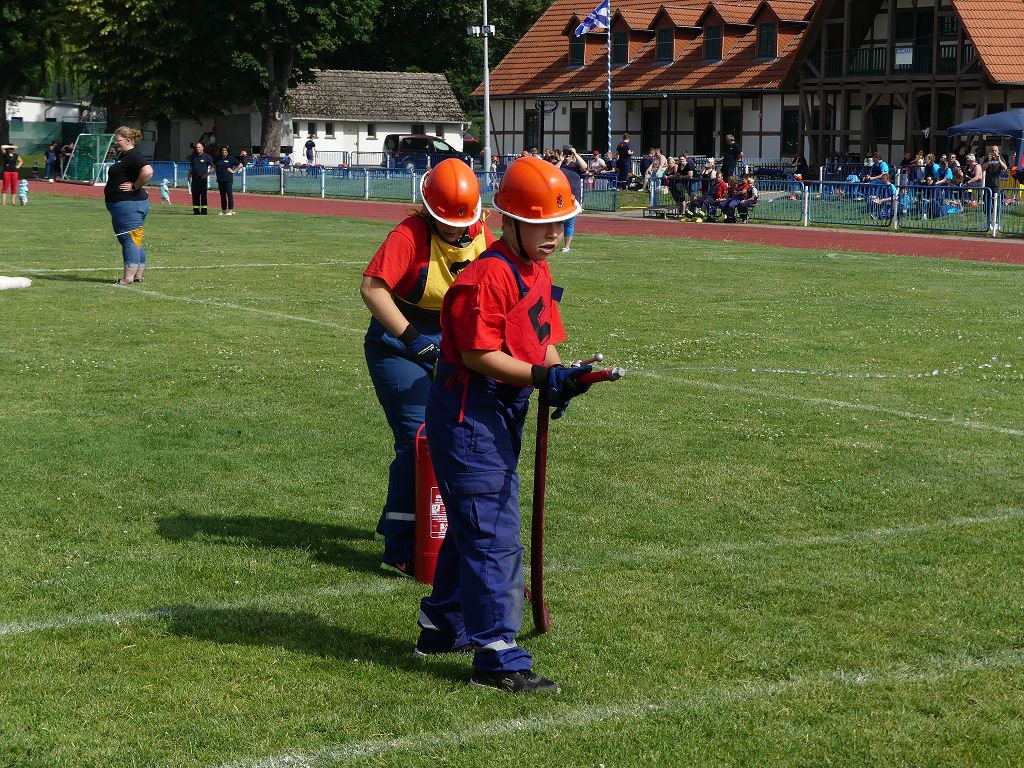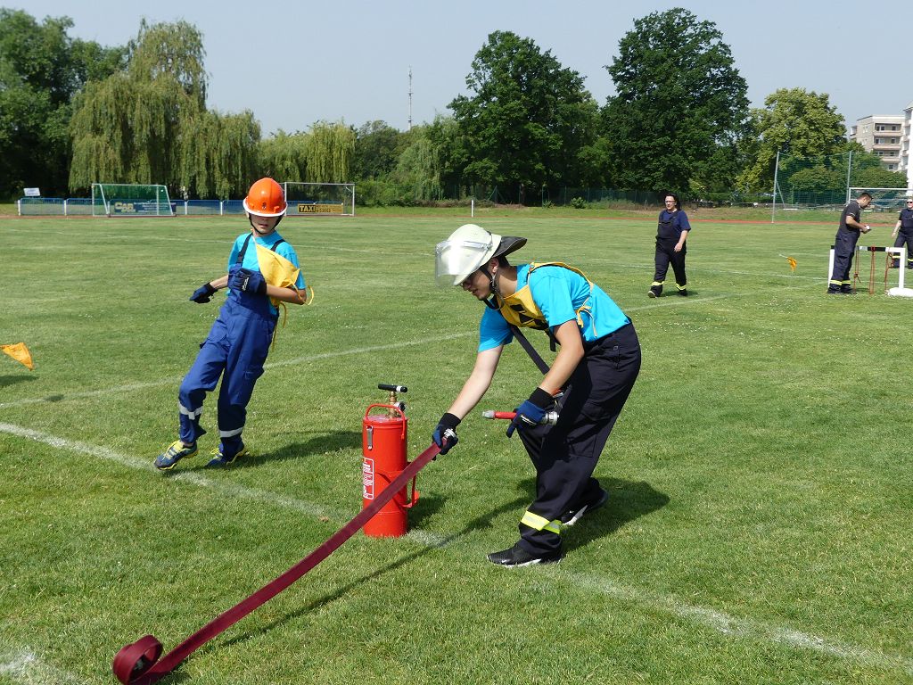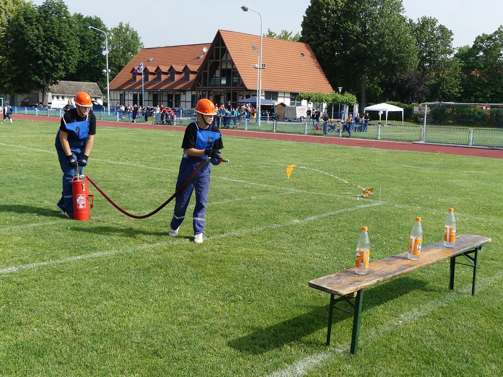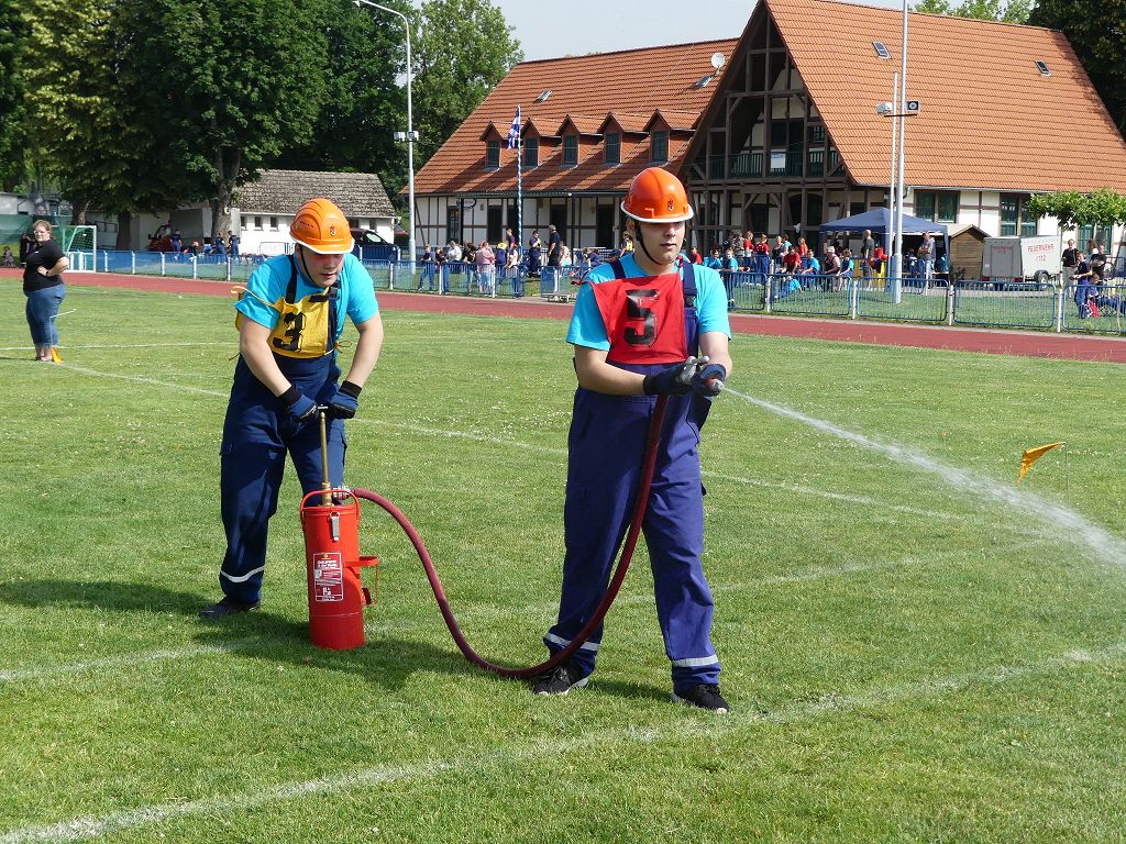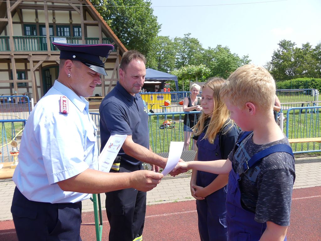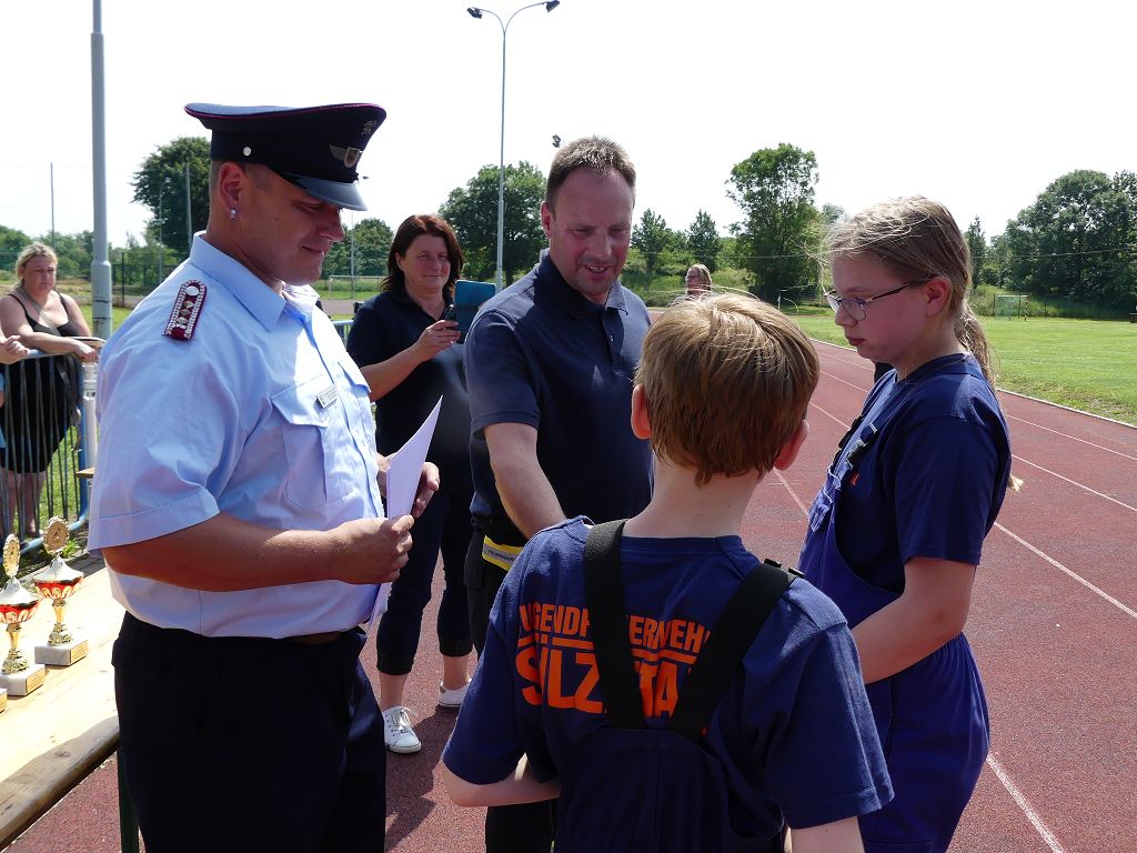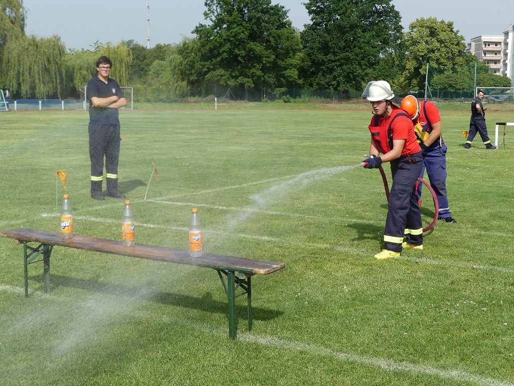 wobei feuerwehrtechnische Aufgaben nach Zeit überwunden werden müssen. Fachbereichsleiter Sandro Schröder konnte am Samstag im Wanzleber Bördestadion, 9 Mannschaften und folgende Gäste begrüßen: Landtagsabgeordnete Silke Schindler, Ordnungsamtsleiter der Stadt Wanzleben Kai Pluntke, den Bürgermeister des Sülzetals Jörg Methner, Wanzlebens Stadtwehrleiter Burkard Wegner, den Vorsitzenden des Feuerwehrverbandes Börde e.V. Harald Hinz, sowie den Verbandsjugendfeuerwehrwart Thomas Ehrhardt. Alle Gäste wünschten den Teilnehmern viel Erfolg beim Wettkampf. Um kurz nach 09.00 Uhr ging dann die erste Mannschaft an den Start. Nach dem Startkommando laufen 2 Jugendfeuerwehrmitglieder zur Verteilerlinie und verbinden einen B-Schlauch mit einem Verteiler. Ein Mitglied läuft zurück und schlägt den nächsten Läufer an, welcher dann mit einem C-Schlauch sich auf dem Weg zum Verteiler macht. Beide Mitglieder laufen dann zum anderen Ende des Schlauches und kuppeln ein Strahlrohr an. Nach dem Durchkriechen einer Hürde wird der nächste Läufer an der Startlinie abgeklatscht. Dieser muss dann 3 Knoten an einer 50 m entfernten Hürde binden und im Anschluss zur Startlinie zurücklaufen. Für 2 weitere Läufer geht es dann im Laufschritt zur Kübelspritze. Während ein Mitglied, Schlauch und Strahlrohr an der Kübelspritze ankuppelt, umrundet das 2. Mitglied diese und schlägt den Läufer am Strahlrohr ab. Dieser läuft zur Kübelspritze und bedient diese. Im Ziel galt es leere Flaschen mit dem Wasserstrahl umzuschießen. Der Strahlrohrführer muss dann zurück zur Startlinie laufen, um den Wettkampf zu beenden. Jede Mannschaft hatte 2 Läufe zu absolvieren. Gegen Mittag begann das Rechnen im Wettkampfbüro. So wurde aus den Laufzeiten und Fehlerpunkten, die Siegermannschaft ermittelt. Fachbereichsleiter Sandro Schröder und der stellvertretende Verbandsjugendfeuerwehrwart Markus Skurk übernahmen dann die Siegerehrung. Die 1.Mannschaft des Lokalmatadoren aus Wanzleben hatte am Ende die Nase vorn und konnte den Siegelpokal in Empfang nehmen. Den 2.Platz erreichte die Jugendfeuerwehr Osterweddingen 2, dicht gefolgt von der Gruppe Wanzleben 2. Verlierer gab es aber nicht, denn alle Gruppen meisterten den Parcours bei den sommerlichen Temperaturen mit Bravour und bekamen hierfür viel Lob. Ein großes Dankeschön richtete Sandro Schröder an die Stadt Wanzleben für die Bereitstellung des Sportplatzes, an den Förderverein der Feuerwehr Wanzleben für die Versorgung mit Speisen und Getränke, sowie an alle Wertungsrichter und Helferinnen und Helfer, sowie natürlich an alle teilnehmenden Jugendfeuerwehren. Herzlichen Glückwunsch noch einmal an den Verbandsmeister 2019.