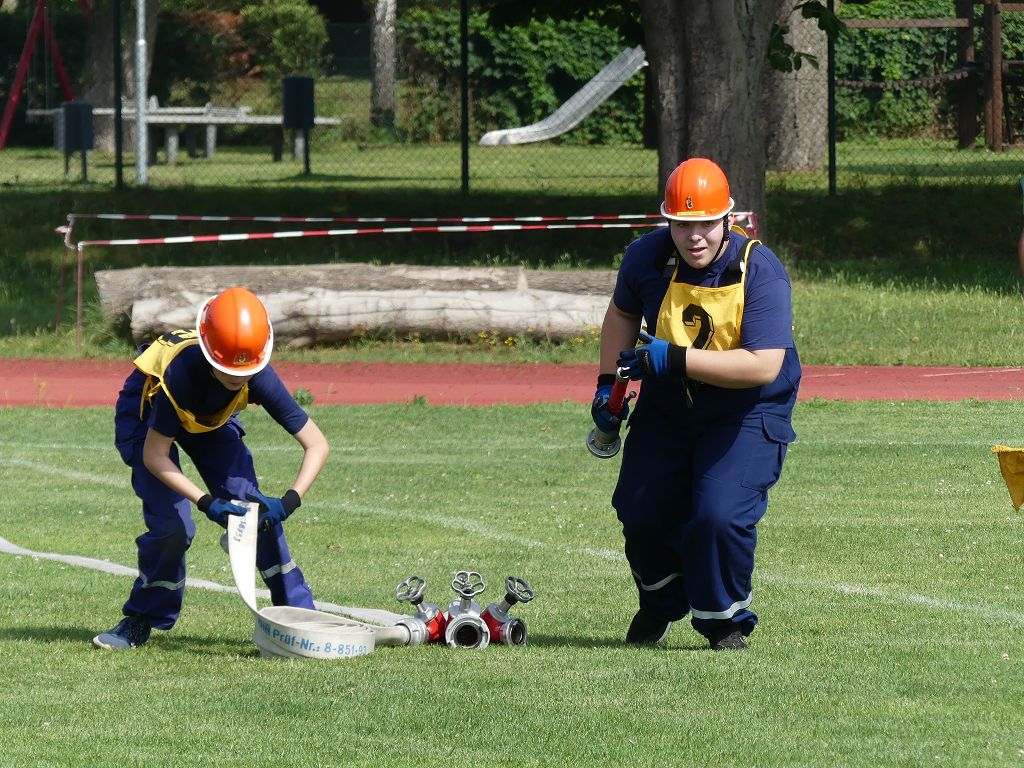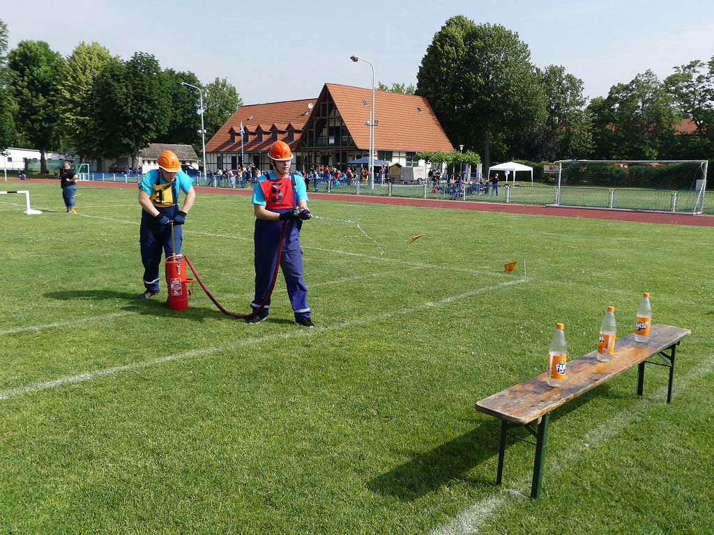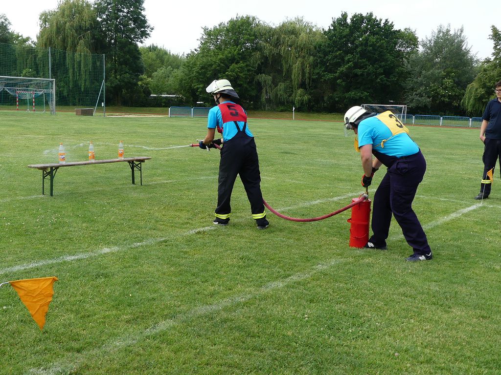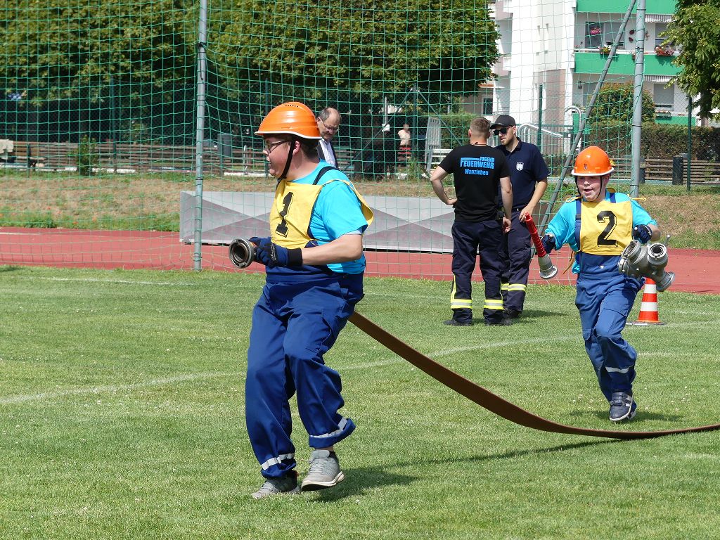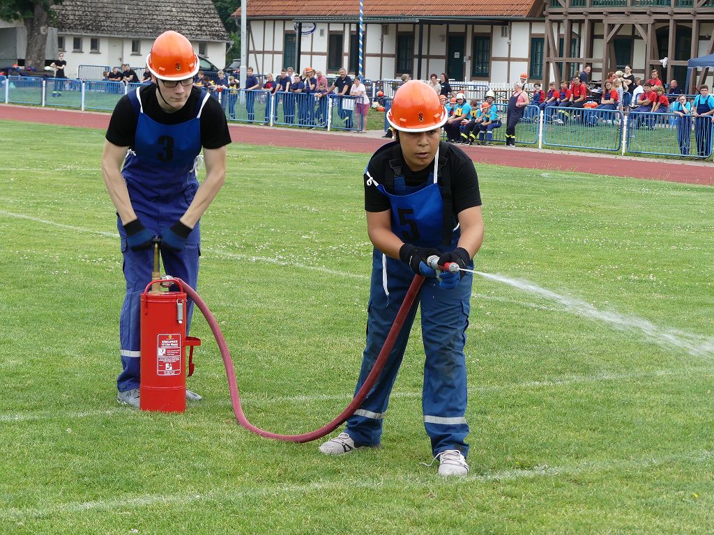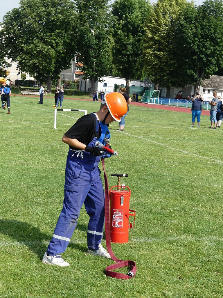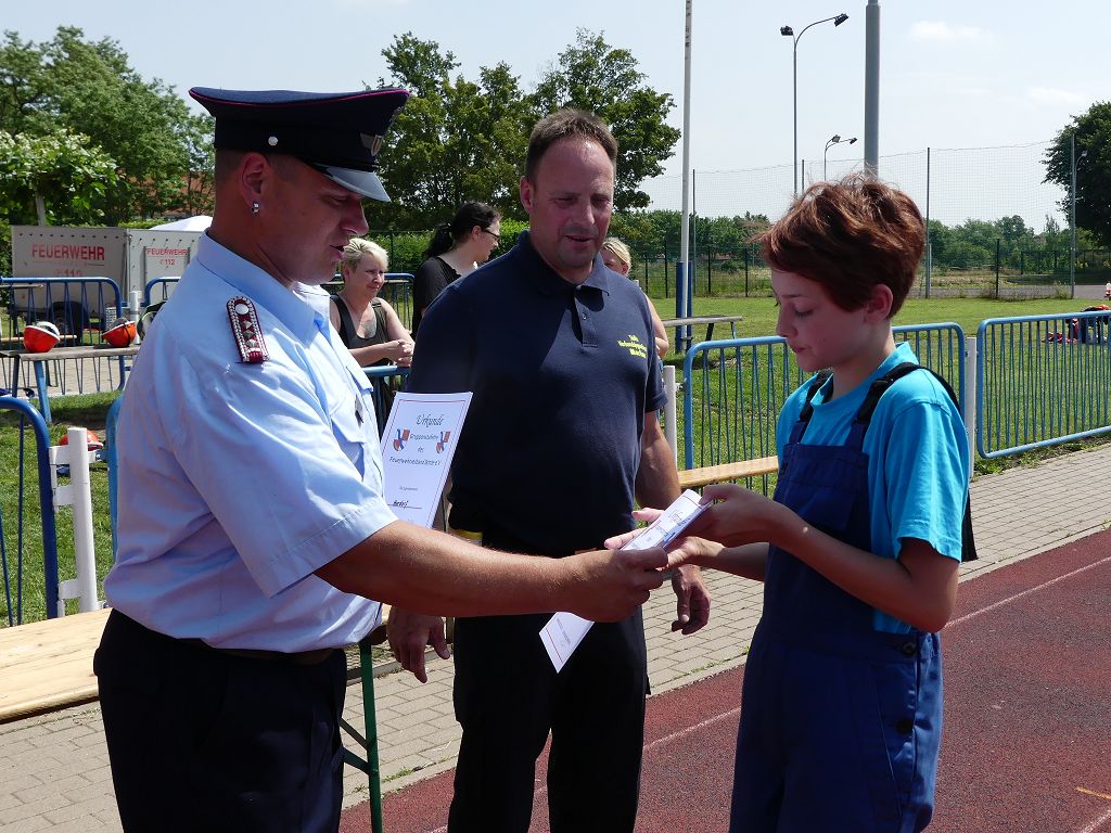 wobei feuerwehrtechnische Aufgaben nach Zeit überwunden werden müssen. Fachbereichsleiter Sandro Schröder konnte am Samstag im Wanzleber Bördestadion, 9 Mannschaften und folgende Gäste begrüßen: Landtagsabgeordnete Silke Schindler, Ordnungsamtsleiter der Stadt Wanzleben Kai Pluntke, den Bürgermeister des Sülzetals Jörg Methner, Wanzlebens Stadtwehrleiter Burkard Wegner, den Vorsitzenden des Feuerwehrverbandes Börde e.V. Harald Hinz, sowie den Verbandsjugendfeuerwehrwart Thomas Ehrhardt. Alle Gäste wünschten den Teilnehmern viel Erfolg beim Wettkampf. Um kurz nach 09.00 Uhr ging dann die erste Mannschaft an den Start. Nach dem Startkommando laufen 2 Jugendfeuerwehrmitglieder zur Verteilerlinie und verbinden einen B-Schlauch mit einem Verteiler. Ein Mitglied läuft zurück und schlägt den nächsten Läufer an, welcher dann mit einem C-Schlauch sich auf dem Weg zum Verteiler macht. Beide Mitglieder laufen dann zum anderen Ende des Schlauches und kuppeln ein Strahlrohr an. Nach dem Durchkriechen einer Hürde wird der nächste Läufer an der Startlinie abgeklatscht. Dieser muss dann 3 Knoten an einer 50 m entfernten Hürde binden und im Anschluss zur Startlinie zurücklaufen. Für 2 weitere Läufer geht es dann im Laufschritt zur Kübelspritze. Während ein Mitglied, Schlauch und Strahlrohr an der Kübelspritze ankuppelt, umrundet das 2. Mitglied diese und schlägt den Läufer am Strahlrohr ab. Dieser läuft zur Kübelspritze und bedient diese. Im Ziel galt es leere Flaschen mit dem Wasserstrahl umzuschießen. Der Strahlrohrführer muss dann zurück zur Startlinie laufen, um den Wettkampf zu beenden. Jede Mannschaft hatte 2 Läufe zu absolvieren. Gegen Mittag begann das Rechnen im Wettkampfbüro. So wurde aus den Laufzeiten und Fehlerpunkten, die Siegermannschaft ermittelt. Fachbereichsleiter Sandro Schröder und der stellvertretende Verbandsjugendfeuerwehrwart Markus Skurk übernahmen dann die Siegerehrung. Die 1.Mannschaft des Lokalmatadoren aus Wanzleben hatte am Ende die Nase vorn und konnte den Siegelpokal in Empfang nehmen. Den 2.Platz erreichte die Jugendfeuerwehr Osterweddingen 2, dicht gefolgt von der Gruppe Wanzleben 2. Verlierer gab es aber nicht, denn alle Gruppen meisterten den Parcours bei den sommerlichen Temperaturen mit Bravour und bekamen hierfür viel Lob. Ein großes Dankeschön richtete Sandro Schröder an die Stadt Wanzleben für die Bereitstellung des Sportplatzes, an den Förderverein der Feuerwehr Wanzleben für die Versorgung mit Speisen und Getränke, sowie an alle Wertungsrichter und Helferinnen und Helfer, sowie natürlich an alle teilnehmenden Jugendfeuerwehren. Herzlichen Glückwunsch noch einmal an den Verbandsmeister 2019.
