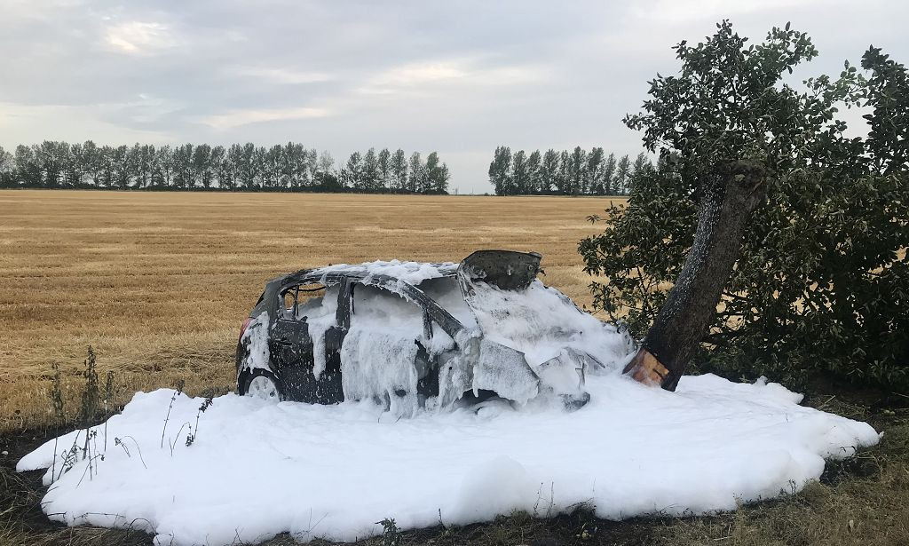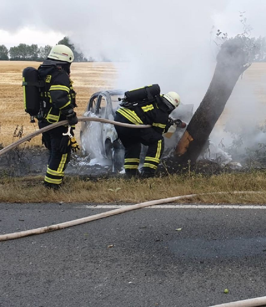 In Folge eines Zusammenpralls des PKW mit einem Baum am Straßenrand, fing das Fahrzeug Feuer und stand bei Ankunft der Feuerwehr in Vollbrand. Insassen waren zu diesem Zeitpunkt nicht mehr im Fahrzeug.