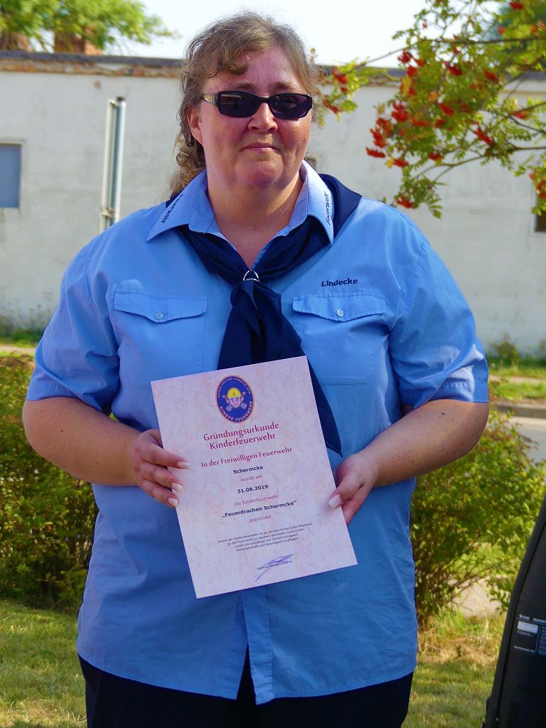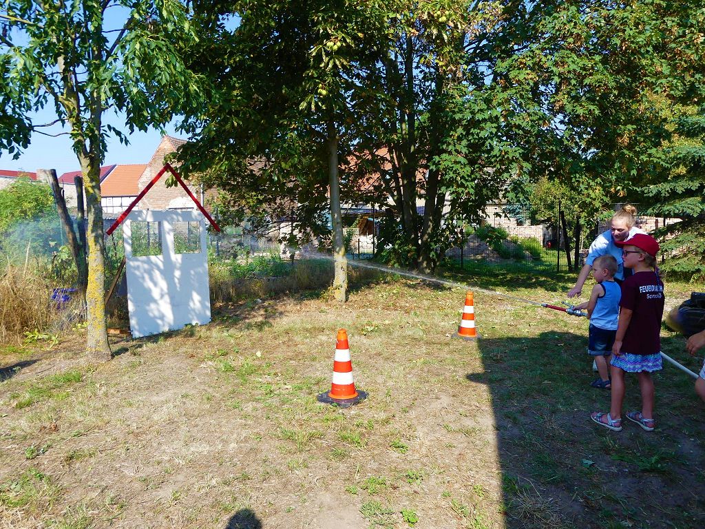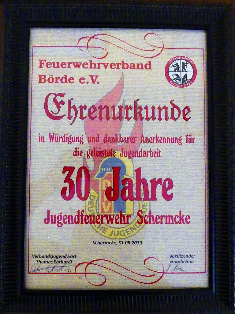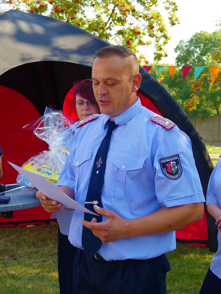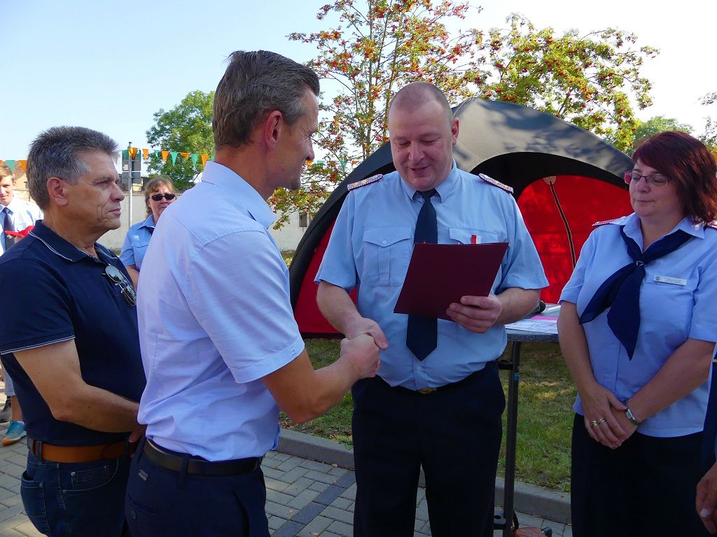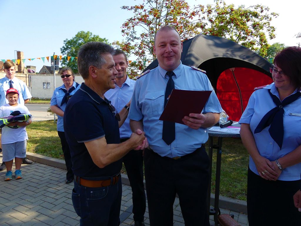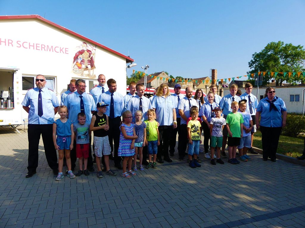 So nahm die Kinderfeuerwehr „Feuerdrachen“ Schermcke an diesem Tag, offiziell ihren Dienst auf. Ortswehrleiter Heiko Lindecke konnte zur Eröffnung folgende Gäste begrüßen: Bürgermeister Benjamin Kanngießer, Ordnungsamtsleiter Gerd Ludwig, Ortsbürgermeister Marcel Ott, Stadtwehrleiter Sven Könnecke, Stadtjugendfeuerwehrwartin Christine Peter, Kerstin Hunder vom Feuerwehrverband Börde e.V., Vertreter des Heimatvereins, sowie Pfarrerin Helga Pötzsch. Bürgermeister Benjamin Kanngießer freute sich in seinen Grußworten, dass es bereits die 2. Kinderfeuerwehr ist, die im Bereich der Stadt Oschersleben gegründet wurde. Im März 2016 nahm die Zentrale Oschersleber Kinderfeuerwehr „Bodelöschis“ ihren Dienst auf. Stadtwehrleiter Sven Könnecke freute sich ebenfalls über die Neugründung, da die Mitgliedschaft in einer Kinder- und Jugendfeuerwehr doch eine Alternative zu Handy, Computer und Video darstellen. Die Kinder- und Jugendfeuerwehren der Stadt Oschersleben dienen aber nicht nur der Nachwuchsgewinnung, sondern bietet der gemeinsame Dienst auch eine gute Möglichkeit soziale Kontakte zu knüpfen, Team- und Zusammengehörigkeit zu erfahren und gemeinsame erlebnisreiche Stunden zu erleben. So konnte der Stadtwehrleiter die Gründungsurkunde, ausgestellt vom Landesjugendfeuerwehrwart Thomas Voß, an Susi Lindecke übergeben. 11 Kinder, ab einem Alter von 6 Jahren durften nun ihre Feuerwehruniformen in Empfang nehmen und freuten sich riesig darüber. Susi und Heiko Lindecke, sowie Jan Rettig werden in Zukunft mit den Kindern üben und trainieren. Geburtstag feierte aber nicht nur die Kinderfeuerwehr. Seit 1989 gibt es nämlich die Jugendfeuerwehr Schermcke. Zu diesem 30. Jubiläum kamen ebenfalls viele Glückwünsche. So wurde auch hier eine Ehrenurkunde überreicht. In den Grußworten wurde auch daran erinnert, dass schon seit mehr als 60 Jahren mit Jugendlichen in der Ortsfeuerwehr Schermcke gearbeitet wird. Bis zum Jahr 1989 unter den Namen „AG Junge Brandschutzhelfer“. Im Anschluss gab es noch einen weiteren Grund zur Freude. Ortwehrleiter Heiko Lindecke wurde vom Feuerwehrverband Börde e.V. mit dem Ehrenstern in Bronze für seine langjährige Tätigkeit als Ortswehrleiter und seine Verdienste zum Erhalt der Ortsfeuerwehr ausgezeichnet. Nachdem offiziellen Teil, begann der Tag der offenen Tür, zu dem sich zahlreiche Gäste auf dem Gelände der Feuerwehr tummelten. Für die Kinder gab es eine Hüpfburg und verschiedene Spiele. Hier konnten die kleinen „Feuerwehrdrachen“ schon ihr Künste unter Beweis stellen. So wurde den ganzen Tag ein Jubiläums- und Familienfest in Schermcke gefeiert.