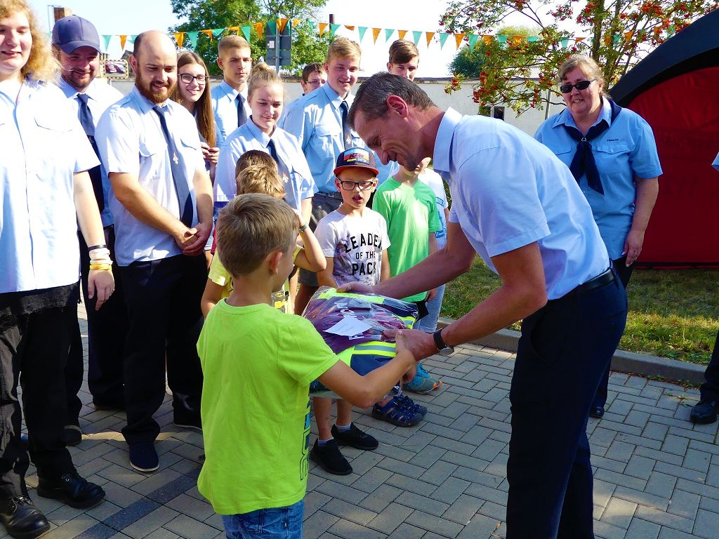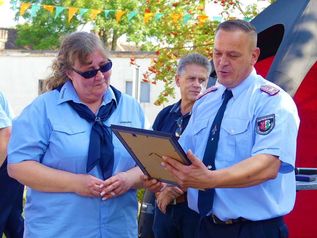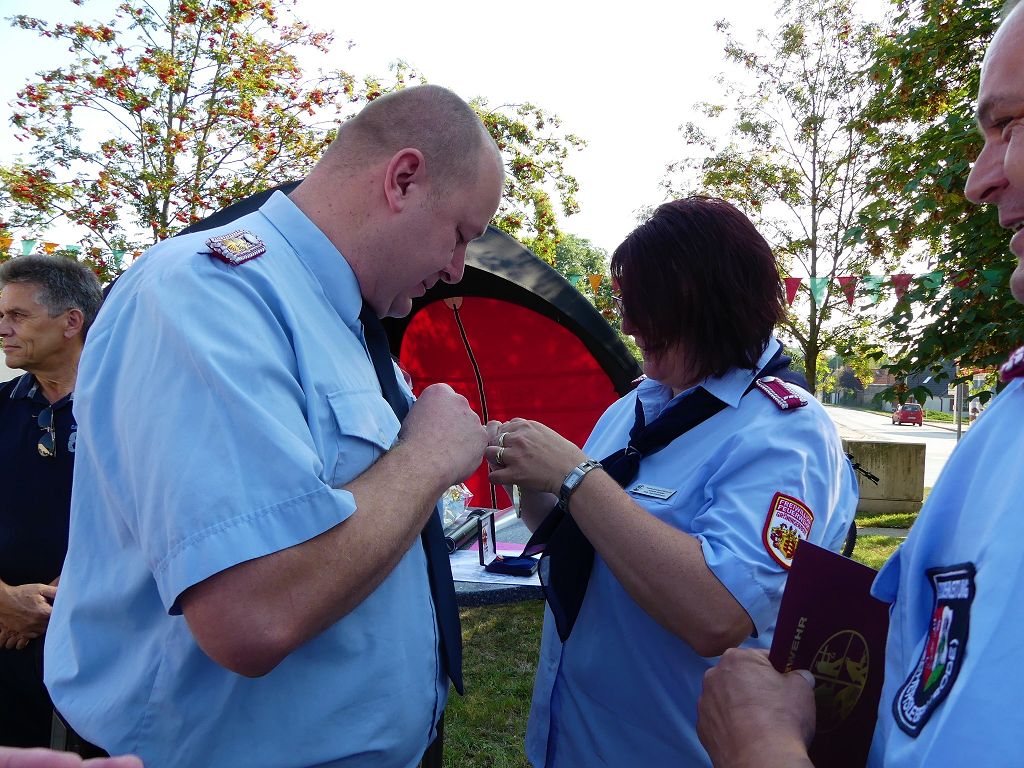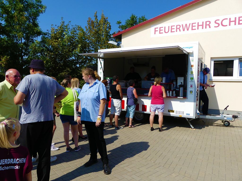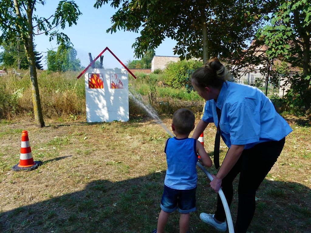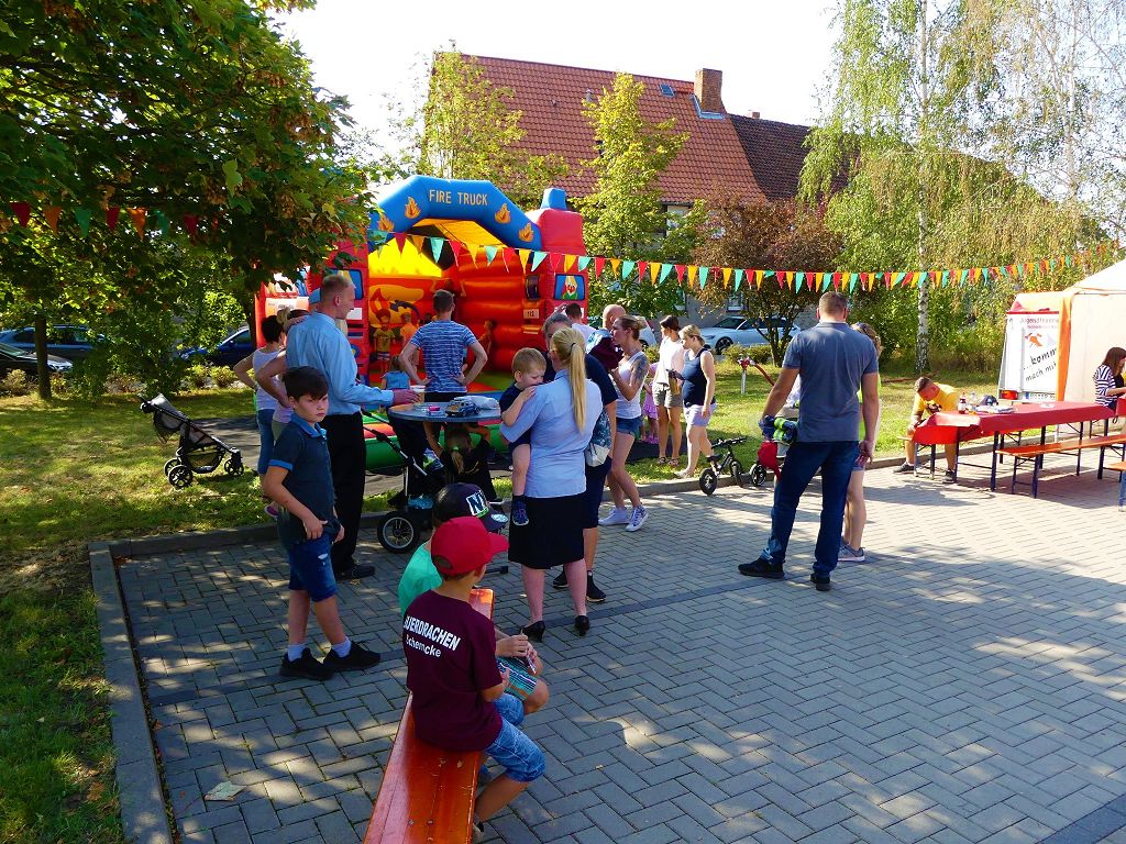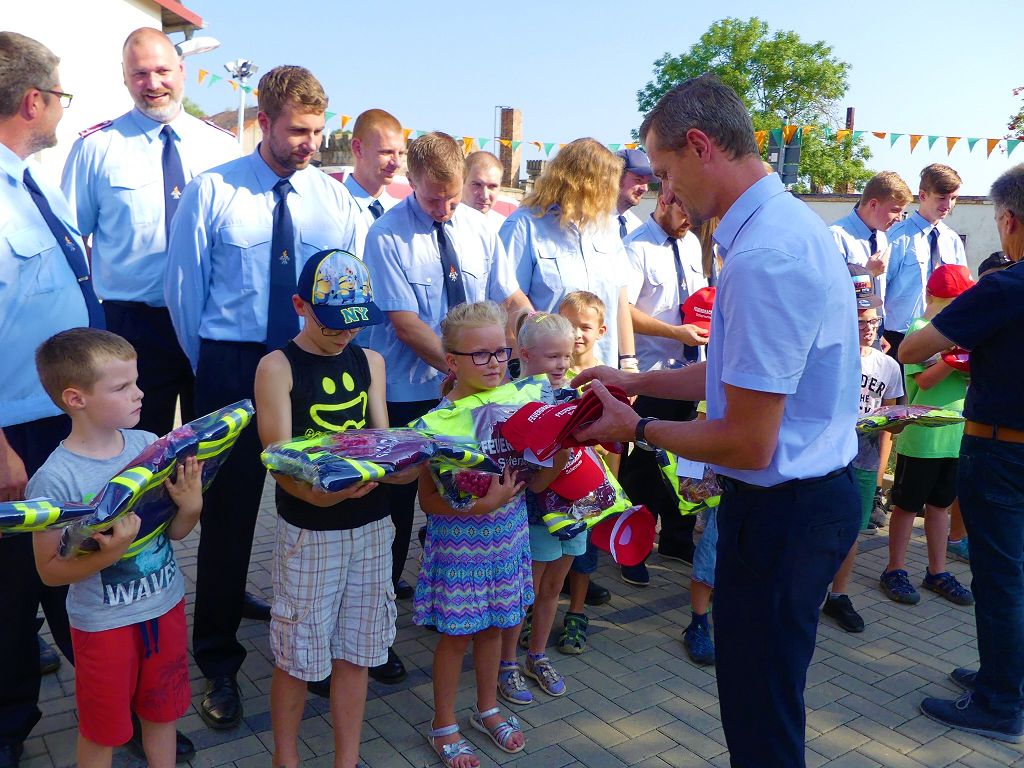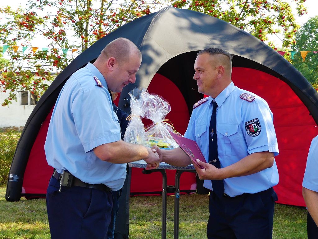 So nahm die Kinderfeuerwehr „Feuerdrachen“ Schermcke an diesem Tag, offiziell ihren Dienst auf. Ortswehrleiter Heiko Lindecke konnte zur Eröffnung folgende Gäste begrüßen: Bürgermeister Benjamin Kanngießer, Ordnungsamtsleiter Gerd Ludwig, Ortsbürgermeister Marcel Ott, Stadtwehrleiter Sven Könnecke, Stadtjugendfeuerwehrwartin Christine Peter, Kerstin Hunder vom Feuerwehrverband Börde e.V., Vertreter des Heimatvereins, sowie Pfarrerin Helga Pötzsch. Bürgermeister Benjamin Kanngießer freute sich in seinen Grußworten, dass es bereits die 2. Kinderfeuerwehr ist, die im Bereich der Stadt Oschersleben gegründet wurde. Im März 2016 nahm die Zentrale Oschersleber Kinderfeuerwehr „Bodelöschis“ ihren Dienst auf. Stadtwehrleiter Sven Könnecke freute sich ebenfalls über die Neugründung, da die Mitgliedschaft in einer Kinder- und Jugendfeuerwehr doch eine Alternative zu Handy, Computer und Video darstellen. Die Kinder- und Jugendfeuerwehren der Stadt Oschersleben dienen aber nicht nur der Nachwuchsgewinnung, sondern bietet der gemeinsame Dienst auch eine gute Möglichkeit soziale Kontakte zu knüpfen, Team- und Zusammengehörigkeit zu erfahren und gemeinsame erlebnisreiche Stunden zu erleben. So konnte der Stadtwehrleiter die Gründungsurkunde, ausgestellt vom Landesjugendfeuerwehrwart Thomas Voß, an Susi Lindecke übergeben. 11 Kinder, ab einem Alter von 6 Jahren durften nun ihre Feuerwehruniformen in Empfang nehmen und freuten sich riesig darüber. Susi und Heiko Lindecke, sowie Jan Rettig werden in Zukunft mit den Kindern üben und trainieren. Geburtstag feierte aber nicht nur die Kinderfeuerwehr. Seit 1989 gibt es nämlich die Jugendfeuerwehr Schermcke. Zu diesem 30. Jubiläum kamen ebenfalls viele Glückwünsche. So wurde auch hier eine Ehrenurkunde überreicht. In den Grußworten wurde auch daran erinnert, dass schon seit mehr als 60 Jahren mit Jugendlichen in der Ortsfeuerwehr Schermcke gearbeitet wird. Bis zum Jahr 1989 unter den Namen „AG Junge Brandschutzhelfer“. Im Anschluss gab es noch einen weiteren Grund zur Freude. Ortwehrleiter Heiko Lindecke wurde vom Feuerwehrverband Börde e.V. mit dem Ehrenstern in Bronze für seine langjährige Tätigkeit als Ortswehrleiter und seine Verdienste zum Erhalt der Ortsfeuerwehr ausgezeichnet. Nachdem offiziellen Teil, begann der Tag der offenen Tür, zu dem sich zahlreiche Gäste auf dem Gelände der Feuerwehr tummelten. Für die Kinder gab es eine Hüpfburg und verschiedene Spiele. Hier konnten die kleinen „Feuerwehrdrachen“ schon ihr Künste unter Beweis stellen. So wurde den ganzen Tag ein Jubiläums- und Familienfest in Schermcke gefeiert.