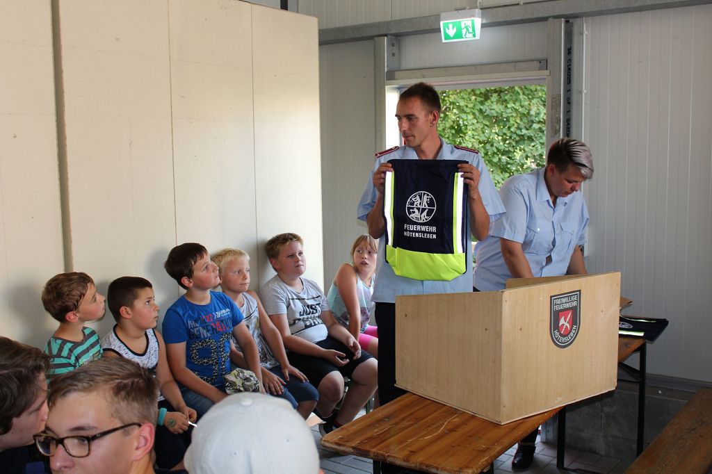 Eine besondere Überraschung für die Kinder und Jugendlichen hielten die Betreuerin der Kinderfeuerwehr Mandy Rügenhagen und der Betreuer der Jugendfeuerwehr David Wiesner bereit. Für jedes Mitglied gab es ein Rucksackbeutel mit Feuerwehrsignet und Feuerwehr Hötensleben Aufschrift. Die Freude war für alle groß.