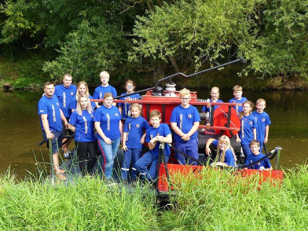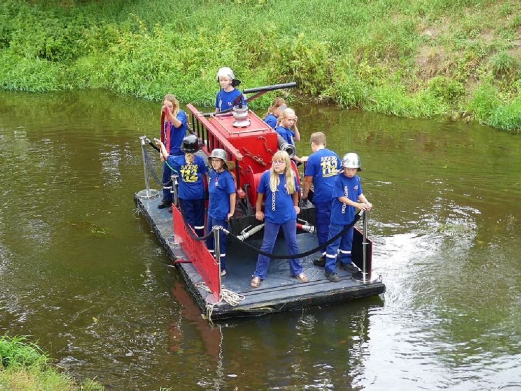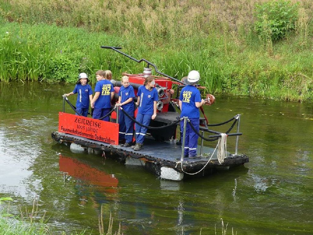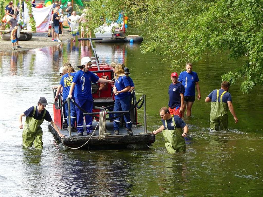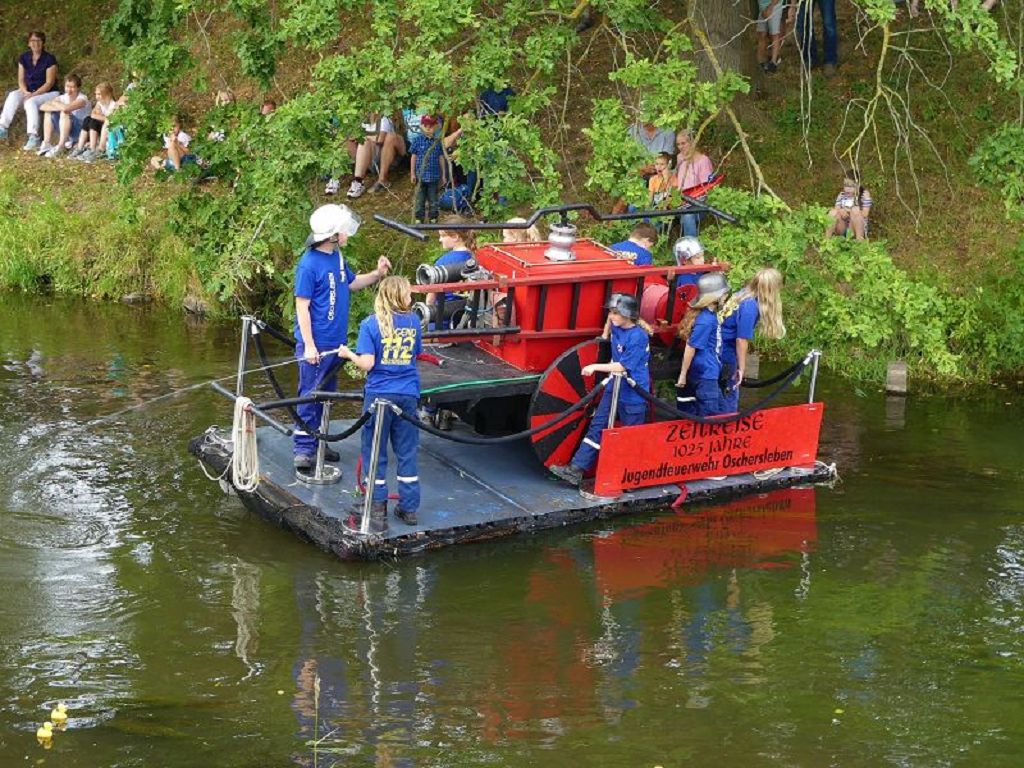 Auch in diesem Jahr brachte der niedrige Wasserstand der Bode wieder einige Probleme mit sich. So konnte der „Ratskahn“ wie auch schon im vergangenen Jahr nicht über die Bode schippern. Leider gingen im Jahr 2019 nur 6 Boote an den Start. Darunter natürlich wieder die Jugendfeuerwehr Oschersleben. Um das Boot in Schwung zu bringen war kräftig Manpower von einigen Kameraden der Feuerwehr und der Wasserwacht gefragt. Thema des Jugendfeuerwehrbootes war der 1025.Geburtstag unserer Stadt. So wurde eine historische Feuerlöschpumpe nachgebaut. Die Kinder hatten bei der gemütlichen Fahrt ins Ziel sehr viel Spaß und bekamen jede Menge Applaus. Die Ortsfeuerwehr Hornhausen war ebenfalls dabei. Zwar hatten sie kein eigenes Boot am Start, kümmerten sich aber wie auch schon in den vergangenen Jahren um das Einfangen der mehr als tausend gelbe Enten. Beim Boderennen in Oschersleben gibt es eine Kinder- und eine Erwachsenenwertung. Da nur das Jugendfeuerwehrboot in der Kinderwertung antrat, sicherte sich die Jugendfeuerwehr den 1. Platz. Herzlichen Glückwunsch.