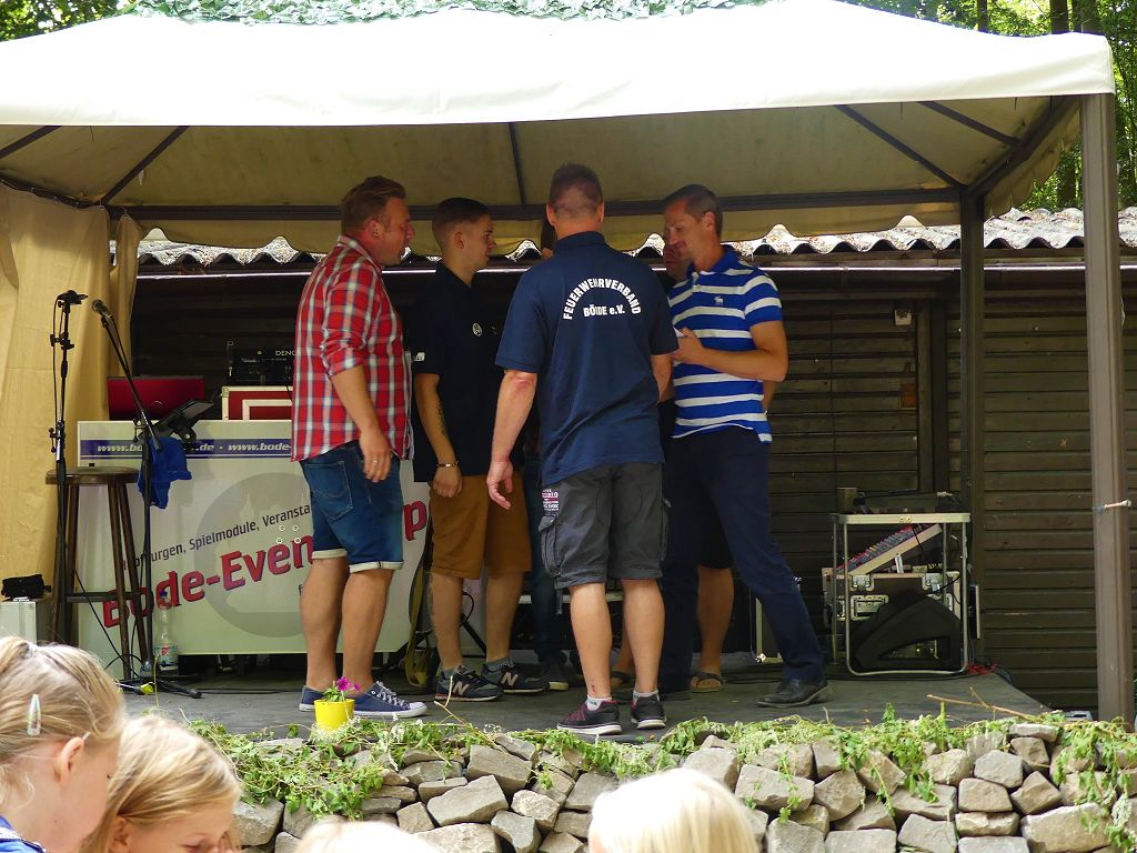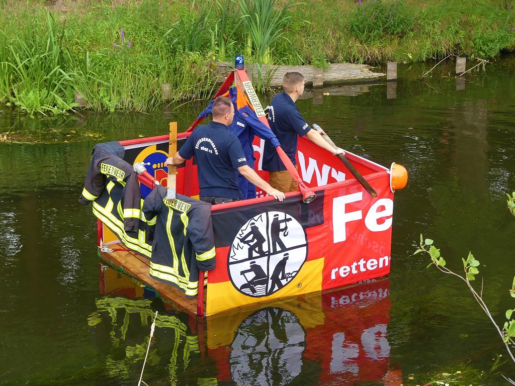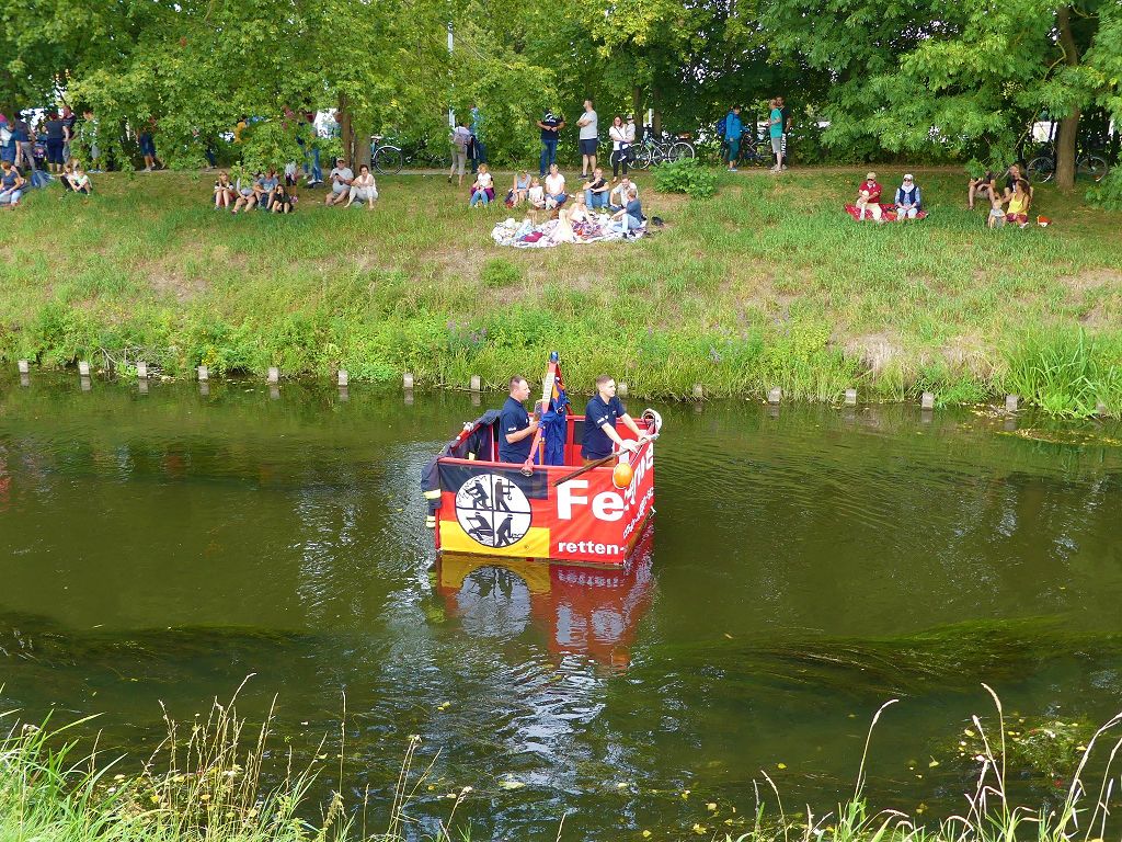 So wurde kräftig geschraubt und gehämmert, damit pünktlich zum Start alles fertig war. Zum Thema machte sich der Feuerwehrverband, die Gewinnung von neuen Mitgliedern in den Feuerwehren. So wurden einige „freie Einsatzjacken“ symbolisch an das Boot angebracht, mit den Slogan: „Hier könnte dein Platz sein“ Auch hier gab es jede Menge Applaus von den Zuschauern. Unterstützung zum Bootsbau kamen vom Oschersleber Stadtwehrleiter Sven Könnecke und von der Ortsfeuerwehr Hornhausen, die das Boot transportierten. Hierfür ein großes Dankeschön. Eine gelungene Premiere für den Feuerwehrverband Börde e.V.