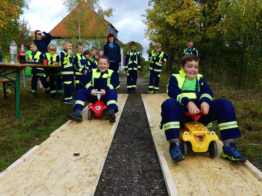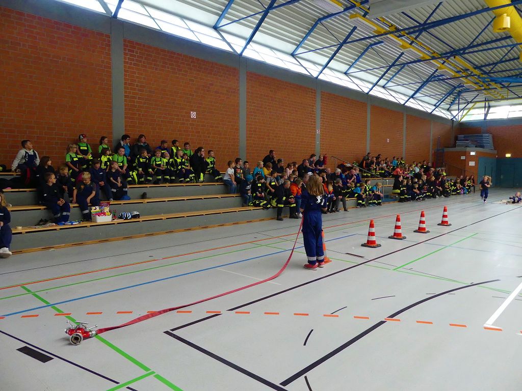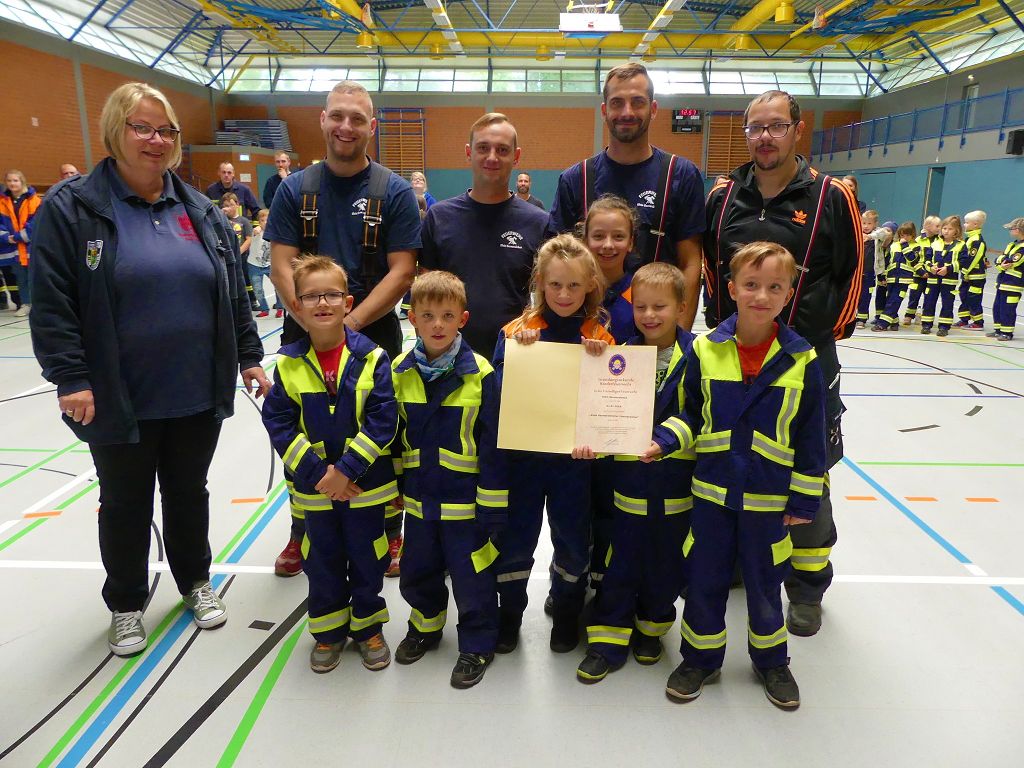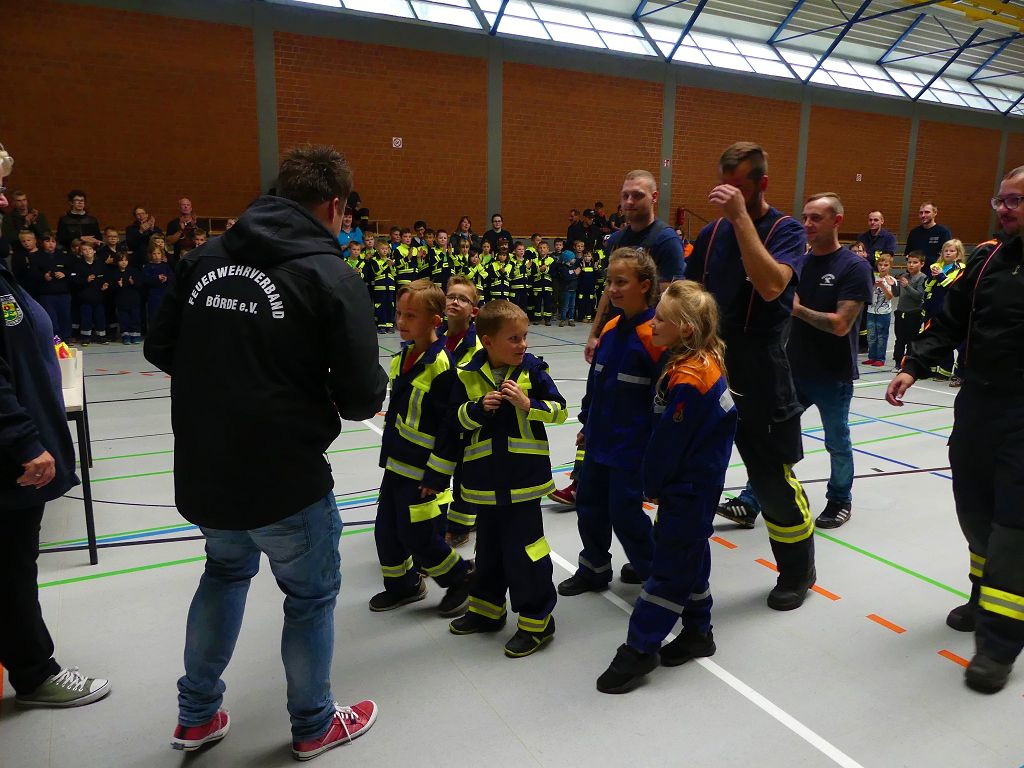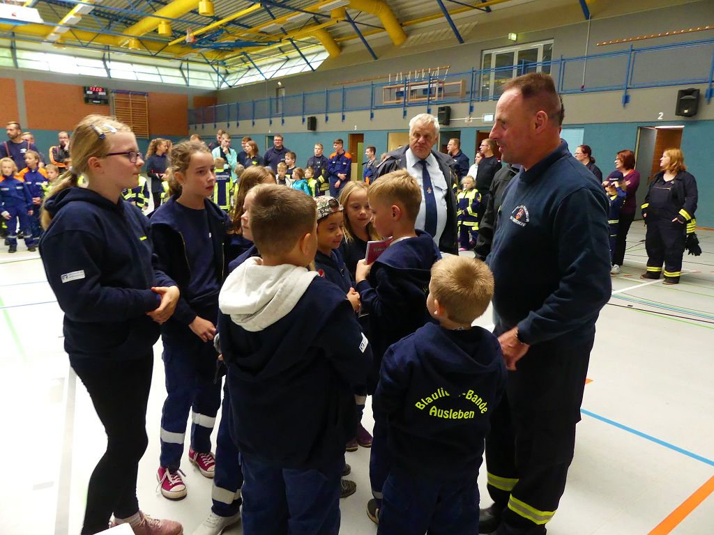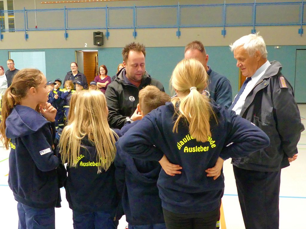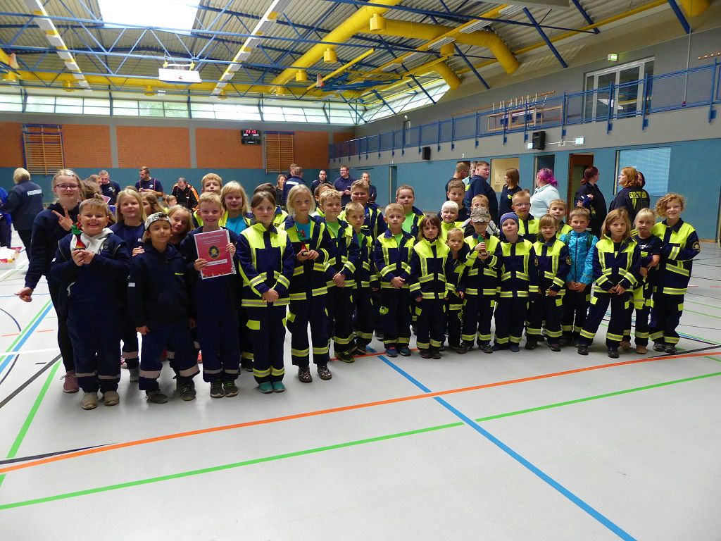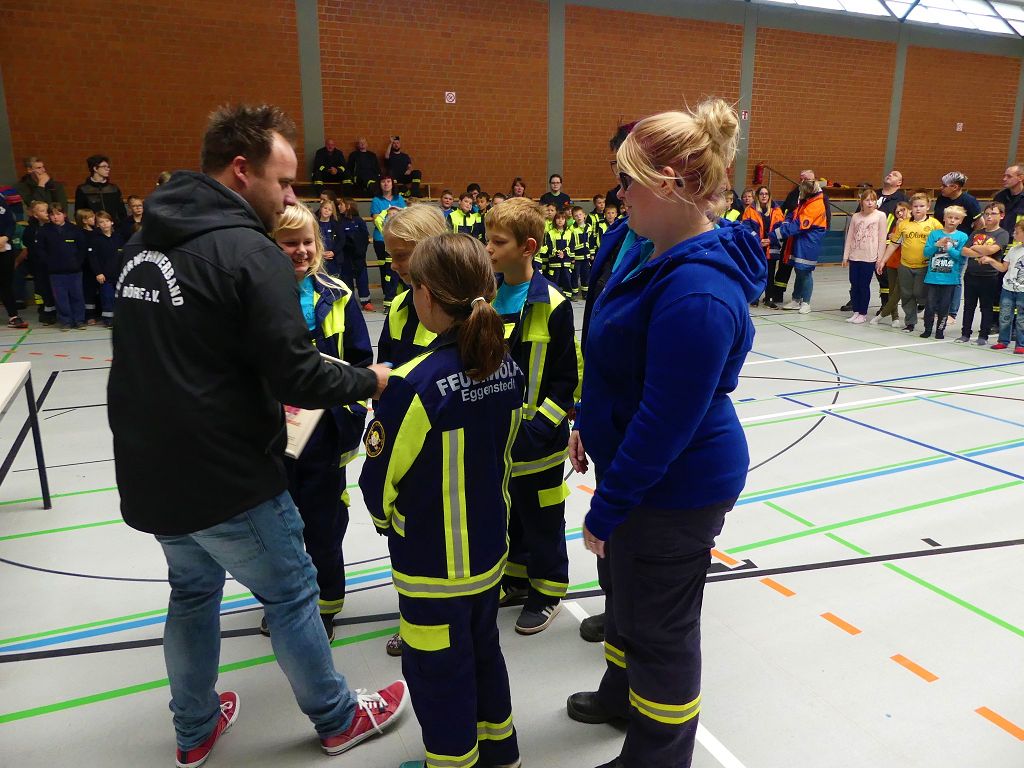 So nahmen mehr als 100 Kinder mit ihren Betreuern daran teil. Mehrere Stationen mit verschiedenen Aufgaben mussten absolviert werden. Darunter waren einige Geschicklichkeits- und Schnelligkeitsspiele. Diese brachten den kleinen Brandschützern viel Spaß. Aber auch ihr Feuerwehrwissen mussten die Kleinen schon unter Beweis stellen. Beim Wissenstest galt es die ersehnten Urkunden in Bronze, Silber und Gold, mit den richtigen Antworten zu erreichen., was auch allen Teilnehmern gelang. Am Ende siegte die Blaulichtbande Gruppe 1 aus Ausleben vor den Alltertaler Löschdrachen Gruppe 1 aus Eilsleben, knapp vor den Kinderfeuerwehren Feuerwölfe Eggenstedt und den Bode Löschis Gruppe 1 aus Oschersleben, welche gemeinsam den dritten Platz belegten. Aber auch alle anderen hatten sichtlich Spaß beim Wettkampf. Die Kinderfeuerwehr Eggenstedt erhielt während der Siegerehrung ein Geschenk und eine Urkunde zu ihrem 5. Geburtstag. An dieser Stelle noch einmal Herzlichen Glückwunsch. Der Feuerwehrverband Börde e.V. bedankte sich ganz herzlich bei der Kreisverkehrswacht Oschersleben. Klaus Glandien unterstützt mit seiner Truppe schon seit vielen Jahren die Feuerwehren im Verbandsgebiet.  Vorstandsvorsitzender Harald Hinz und Verbandsjugendwart Thomas Ehrhardt bedankten sich noch einmal recht herzlich bei allen Kinderfeuerwehren für die Teilnahme.