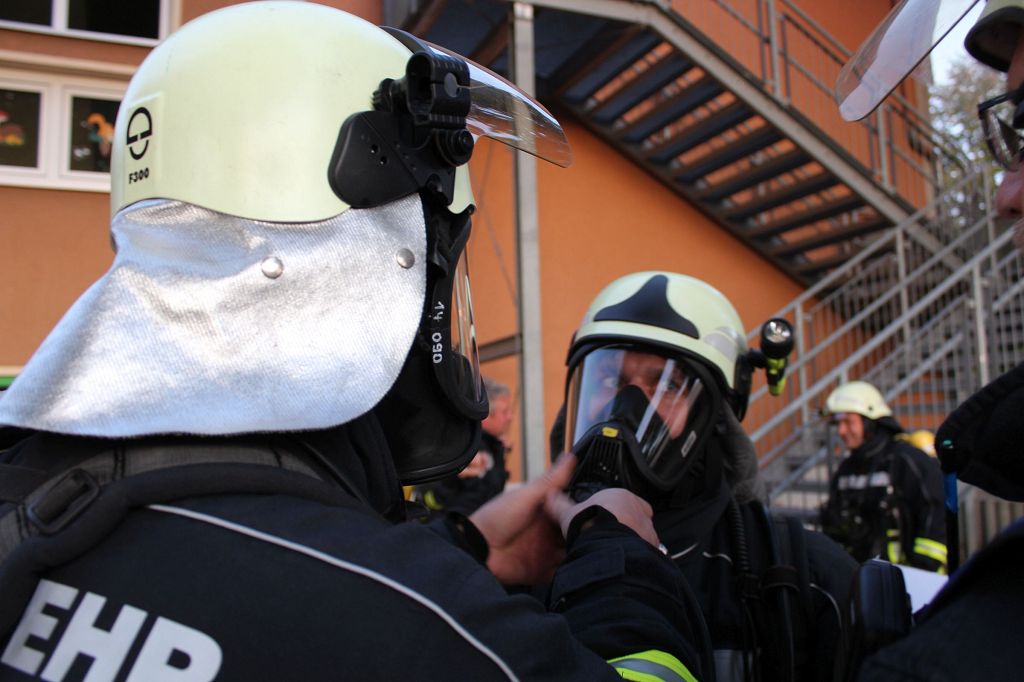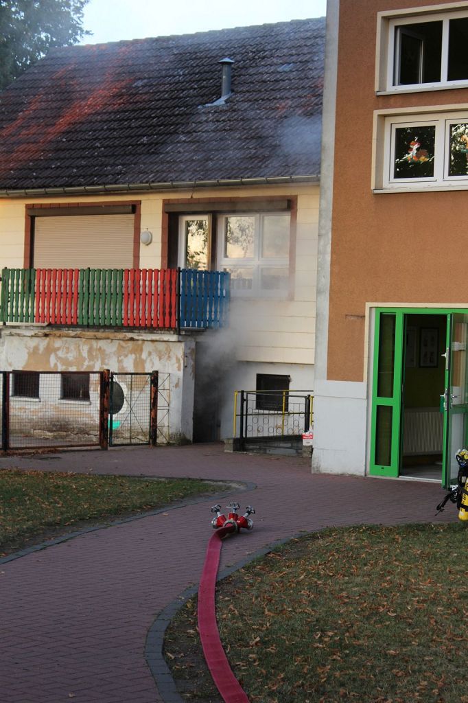 Schläuche wurden verlegt und Atemschutz wurde angelegt, um die zwei vermissten Personen im verrauchten Keller der Kindetagesstätte zu finden. Priorität war, die Einsatzkräfte zielgerichtet zur Menschenrettung einzusetzen, die Löschwasserversorgung über 300 Meter aufzubauen, und umliegende Gebäude vor einer Brandausbreitung zu schützen.