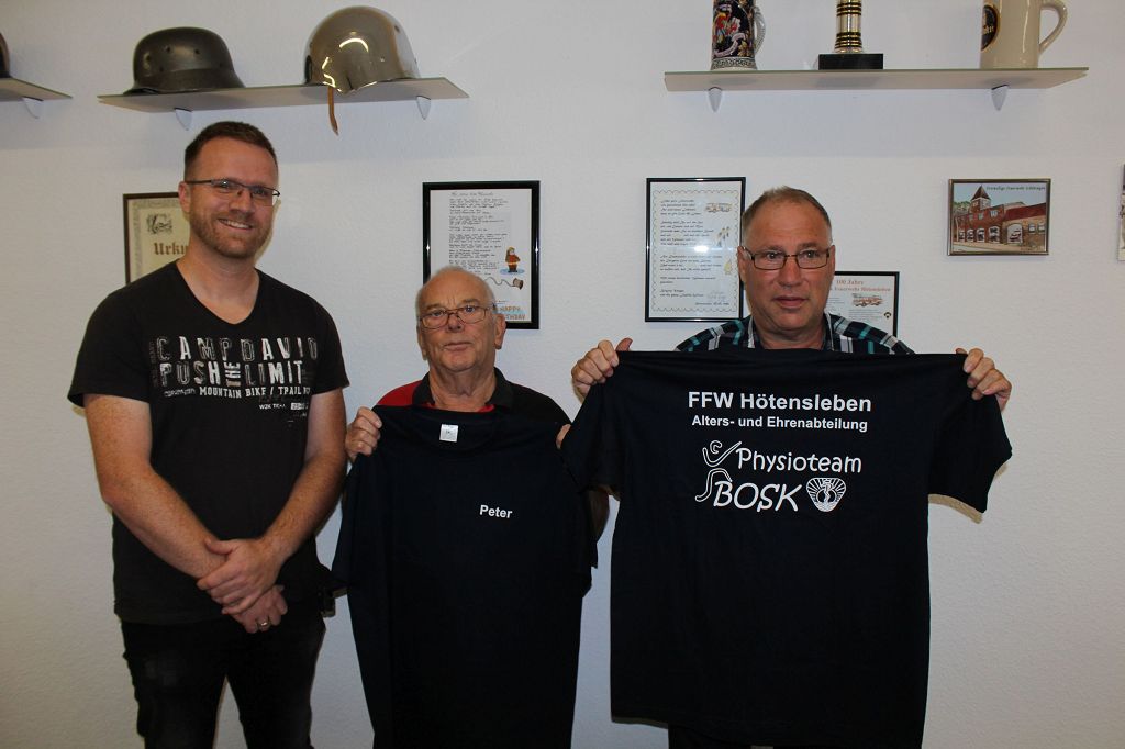 Er übergab gemeinsam mit Kamerad Klaus-Dieter Dietrich T-Shirts für alle Mitglieder der Alters- und Ehrenabteilung Hötensleben. Die Freude bei den verdienten Senioren war sichtbar groß.
