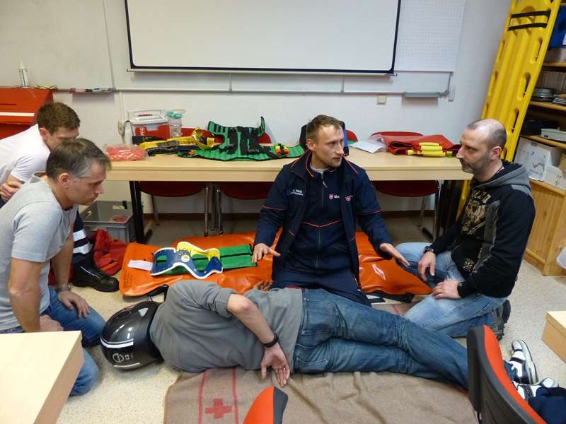 Lehrrettungsassistent Alexander Fuchs von der Malteser Rettungswache Oschersleben unterwies die Kameradinnen und Kameraden u. a. in Reanimation und stabile Seitenlage. Das Abnehmen von Helmen nach Motorradunfällen wurde auch noch einmal geübt. Mit Vakuummatratze, Spineboard und Schaufeltrage wurden auch spezielle Geräte zur Rettung von Unfallopfern gezeigt und ausprobiert.